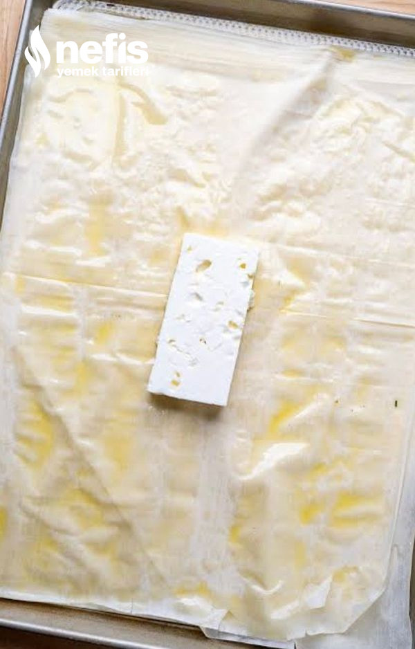 2. Arasına bir parmak kalınlığında bir kesim beyaz peynir dilimini koyup baklava yufkasının yanlarından kapatalım. Daha sonra kalan kenarları da altına katlayalım. Üzerini tekrar yağlayıp susam serpelim.