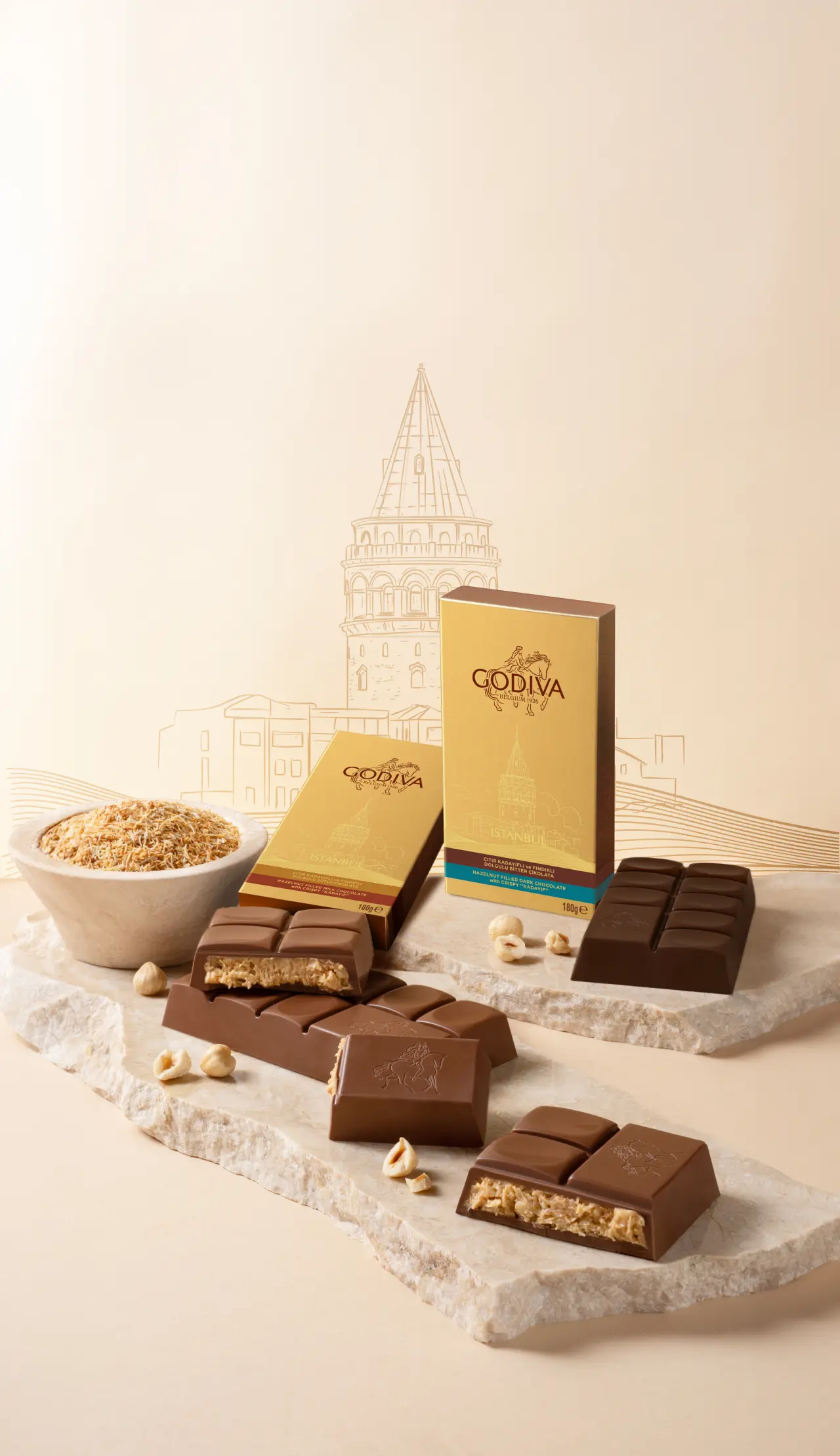GODIVA’nın yeni İstanbul Koleksiyonu, fındıklı dolgu, çıtır kadayıf ve baklava parçaları ile bezenmiş üç ikonik tatın muhteşem bir kombinasyonunu sunuyor. Fındıklı dolgu, geleneksel Türk mutfağının dokusunu ve tatlarını modern çikolata ile harmanlayarak yeni bir boyut kazandırıyor. Çıtır kadayıf ise, yoğun aroması ve farklı dokusuyla bu kombinasyona zenginlik katıyor, böylece tatların birbiriyle muazzam bir uyum içinde dans etmesini sağlıyor. Baklava parçacıkları ise, koleksiyonun Türk kültüründeki yerini pekiştiriyor ve her lokmada nostaljik anıları gün yüzüne çıkarıyor.