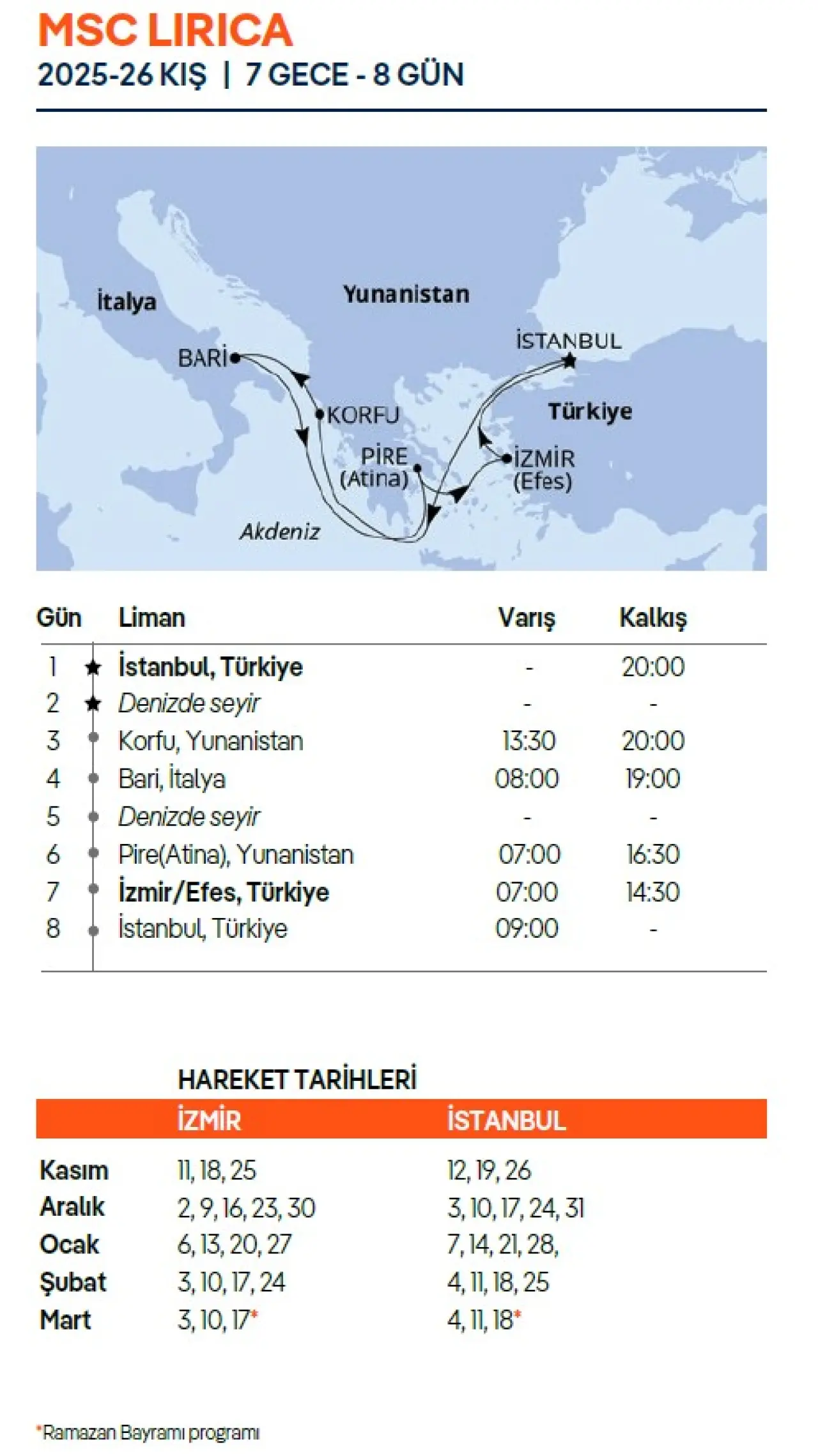 Kış döneminde daha sakin limanları deneyimlemek isteyenler için MSC Lirica’nın rotası oldukça çekici bir seçim olarak öne çıkıyor. İstanbul ve İzmir’den yola çıkan yolcular, Korfu (Yunanistan), Bari (İtalya), Pire/Atina (Yunanistan) ve İzmir/Efes duraklarını kapsayan bu güzergah ile yeniden İstanbul’a dönecekler. Bu özel kış rotası, tarih, kültür ve gastronomi tutkunlarına mevsim kalabalığından uzakta keşif fırsatı sunuyor.