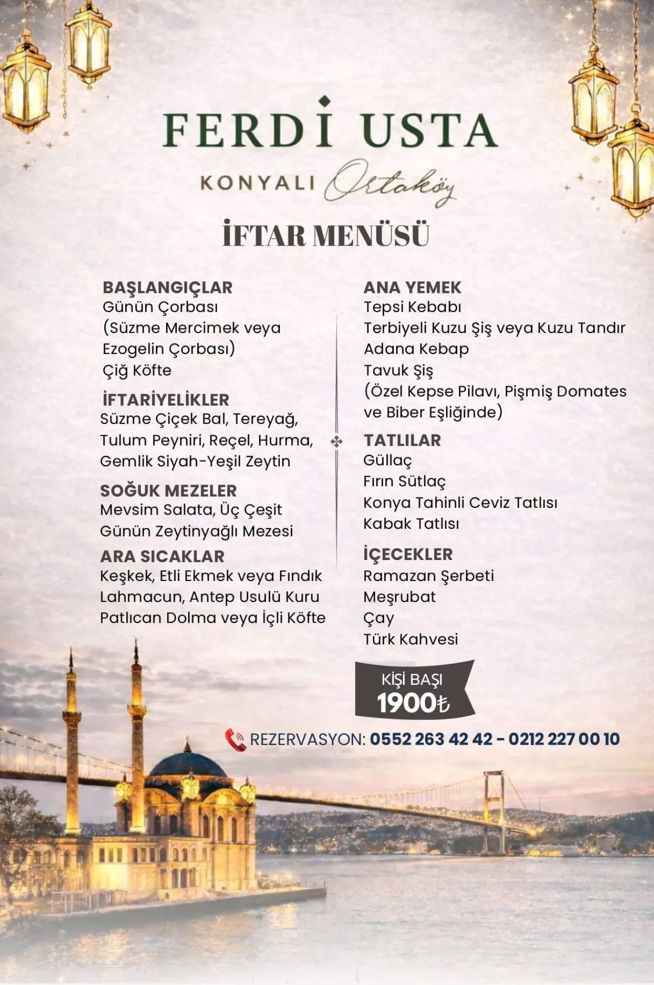 Konyalı Ferdi Usta, Ortaköy'ün muhteşem atmosferinde Boğaz manzarası eşliğinde hazırlandığı iftar sofraları ile özel buluşmaları gerçekleştiriyor. Ailelerin, dost gruplarının ve iş dünyasının bir araya geldiği bu Ramazan sofraları, merkezi konumu ve geniş oturma alanları sayesinde unutulmaz bir deneyim sunuyor. Konyalı Ferdi Usta, hem kurumsal iftar organizasyonları hem de aile buluşmaları için geniş bir alternatif sunarak, misafirlerine keyifli anlar yaşatmayı hedefliyor.
