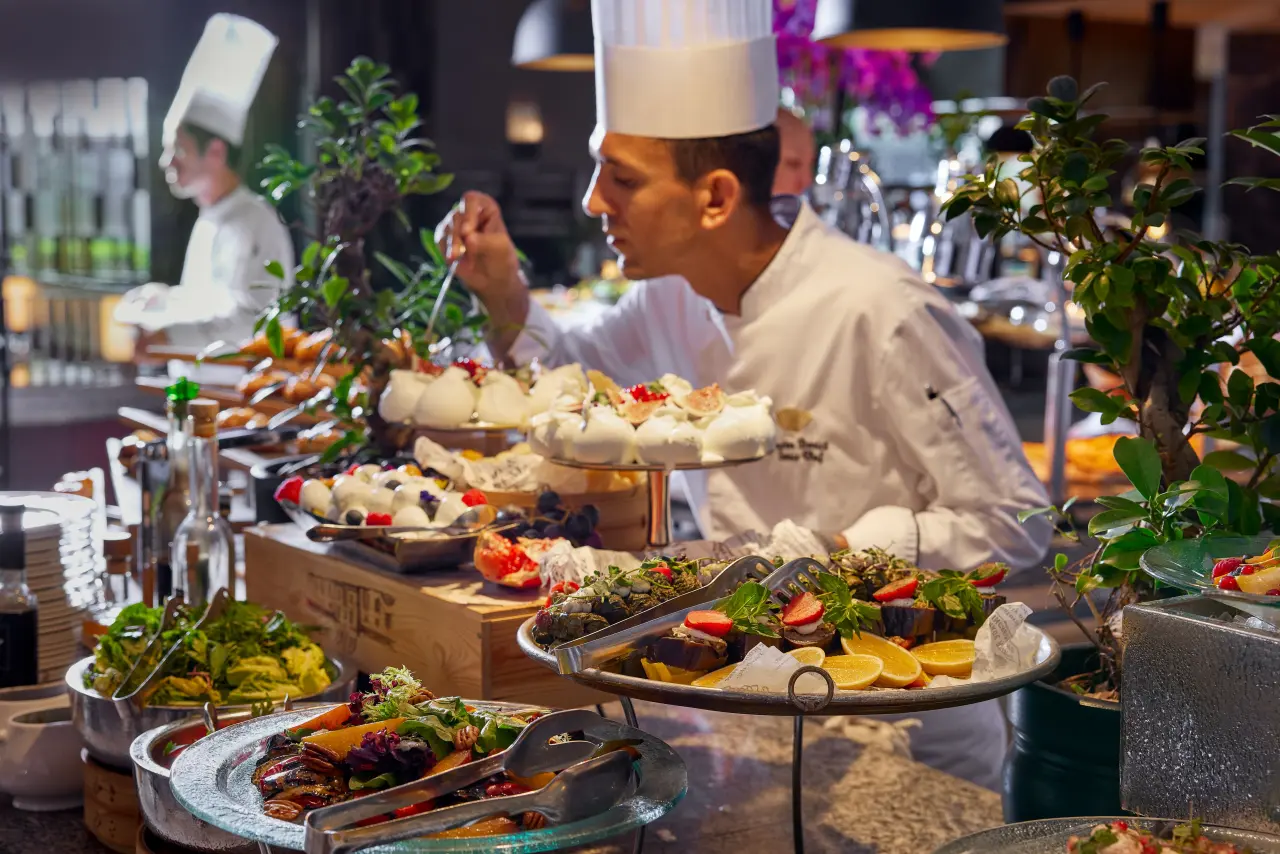 Ramazan Bayramı’na özgü olarak hazırlanan brunch menüsü, geleneksel bayram yemeklerinin tanıdık tatlarını dünya mutfağından özenle seçilen tariflerle bir araya getiriyor. Zengin bir şarküteri ve peynir çeşitliliğinden günlük deniz ürünleri için ustaca hazırlanan et yemeklerine ve fırından çıkan sıcak atıştırmalara kadar uzanan bir sunum, mevsimsel olarak en taze ürünlerle zenginleştiriliyor. Tatlı büfesi ise, klasik Türk tatlıları, pasta şefinin özel tarifleri ve bayrama özgü lezzetlerle dolup taşıyor, sofraya nostaljik bir hava katıyor.