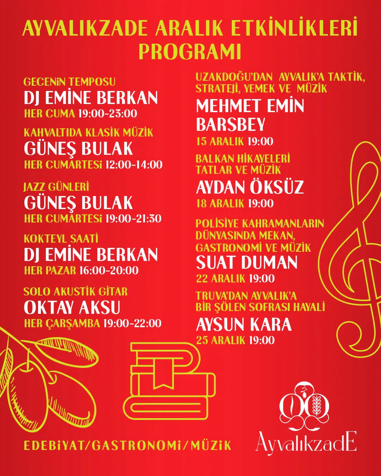 Ayvalıkzade, Aralık 2025'te birçok ilginç etkinlik düzenleyecek. 15 Aralık'ta gerçekleştirilecek olan "Uzakdoğu’dan Ayvalık’a Taktik, Strateji, Yemek ve Müzik" etkinliğinde, Mehmet Emin Barsbey, Uzakdoğu mutfak kültürünü Ayvalık’ın zeytinyağı geleneği ile harmanlayacak. 18 Aralık'taki "Balkan Hikayeleri, Tatlar ve Müzik" etkinliğinde ise İletişim Danışmanı Aydan Öksüz, Ayvalık mutfağının göç hikayesini Balkan melodileriyle yeniden anlatma fırsatı sunacak. 22 Aralık'ta, yazar Suat Duman'ın "Polisiye Kahramanların Dünyasında Mekân, Gastronomi ve Müzik" konulu etkinliğiyle, polisiye edebiyatını mekân, atmosfer ve tatlar üzerinden keşfedeceksiniz. Program, 25 Aralık'ta Aysun Kara'nın mitolojiden günümüze uzanan sofra kültürünü ele alacağı "Truva’dan Ayvalık’a Bir Şölen Sofrası Hayali" isimli etkinlik ile sona erecek.