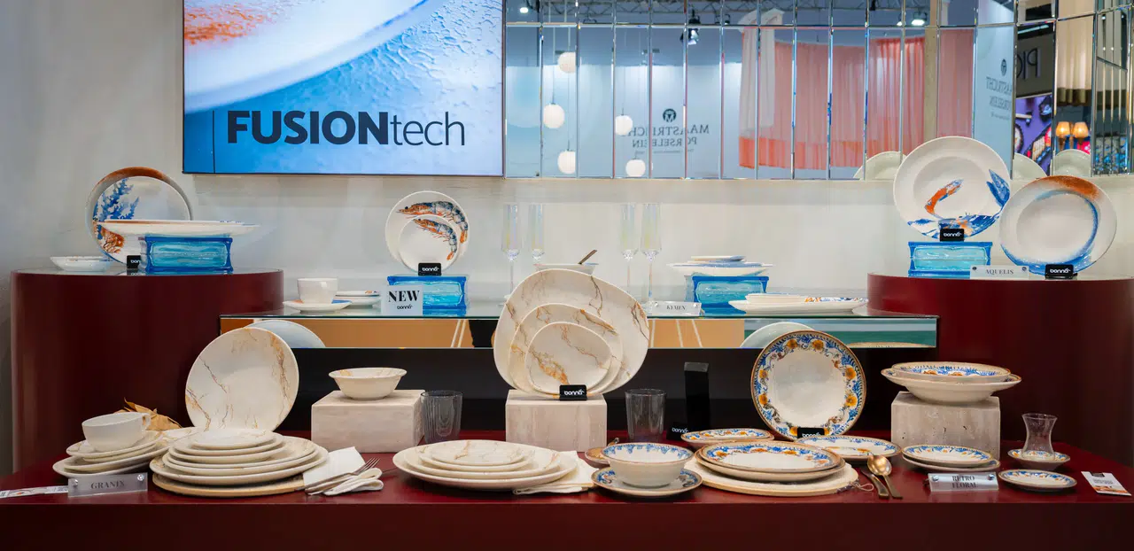 Ambiente Fuarı’nda Bonna'nın sergilediği en dikkat çekici ürünlerinden biri FusionTech teknolojisi ile üretilmiş koleksiyonlar oldu. Bu kategorideki ürünler arasında Kymen, Aqualis, Granix ve Retro Floral gibi modeller öne çıkıyor. Granix serisi, mat yüzeydeki parlak damar efektleriyle dikkat çekerken, profesyonel kullanıma uygun yapı özellikleriyle de göz dolduruyor. Retro Floral, nostaljik ama modern bir estetiği bir araya getirerek sunumlarda güçlü bir karakter ortaya koyuyor. Aqualis, desenlere adeta hayat veren ve yüksek dayanıklılığa sahip bir yüzey yapısı sunarken, Kymen serisi, mat ve parlak doku kontrastıyla derin bir estetik sunuyor. Seçilen formlarda ömür boyu kenar çıtlamazlık garantisi de mevcut.