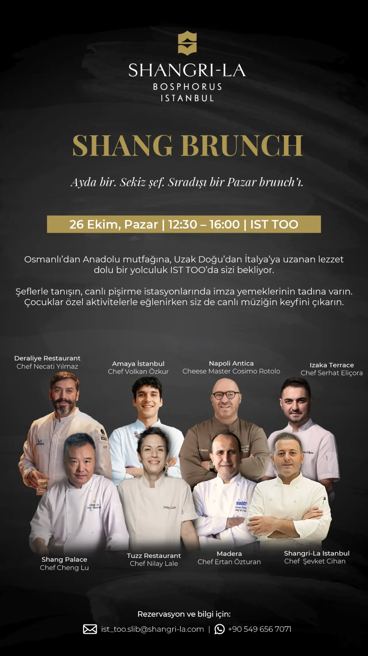 Beşiktaş’ta, Boğaz’ın muhteşem manzarasına karşı konumlanan Shangri-La Bosphorus, bu ayki Shang Brunch deneyimini 26 Ekim Pazar günü 12:30 ile 16:00 saatleri arasında düzenleyecek. Her ay yalnızca bir kez yapılan bu özel brunch, farklı mutfak disiplinlerinde uzmanlaşmış sekiz usta şefin imza tabaklarını bir araya getiriyor. Her şef, kendi mutfağının hikayesini yansıtan özel yemeklerini katılımcılarla buluşturacak. Bu buluşma, İstanbul'un brunch kültürüne taze bir soluk katmayı hedefleyerek, ziyaretçilere unutulmaz bir deneyim sunmak için tasarlanmış bir etkinlik olarak öne çıkıyor.