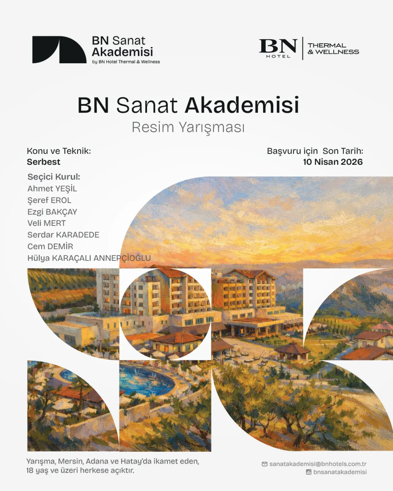 Termalin şifalı etkilerini çağdaş konaklama anlayışıyla birleştirerek Mersin'deki turizm alanına yeni bir soluk kazandıran BN Hotel Thermal & Wellness, geçtiğimiz yıl açtığı Sanat Akademisi ile kültürel mirası modern sanat ile buluşturmayı hedefliyor. Bu çerçevede, BN Sanat Akademisi tarafından düzenlenen ikinci Resim Yarışması için başvuru süreci davam ediyor. Mersin, Adana ve Hatay’dan sanatsal çalışmalarını göndermek isteyen katılımcılar, eserlerinin dijital görsellerini en geç 10 Nisan 2026 tarihinde yarışma komitesine iletebilecekler. Bu yılki yarışmanın finalinde, 45 eser ‘başarı’, ‘mansiyon’ ve ‘sergilenmeye değer’ ödüllerine sahip olacak.