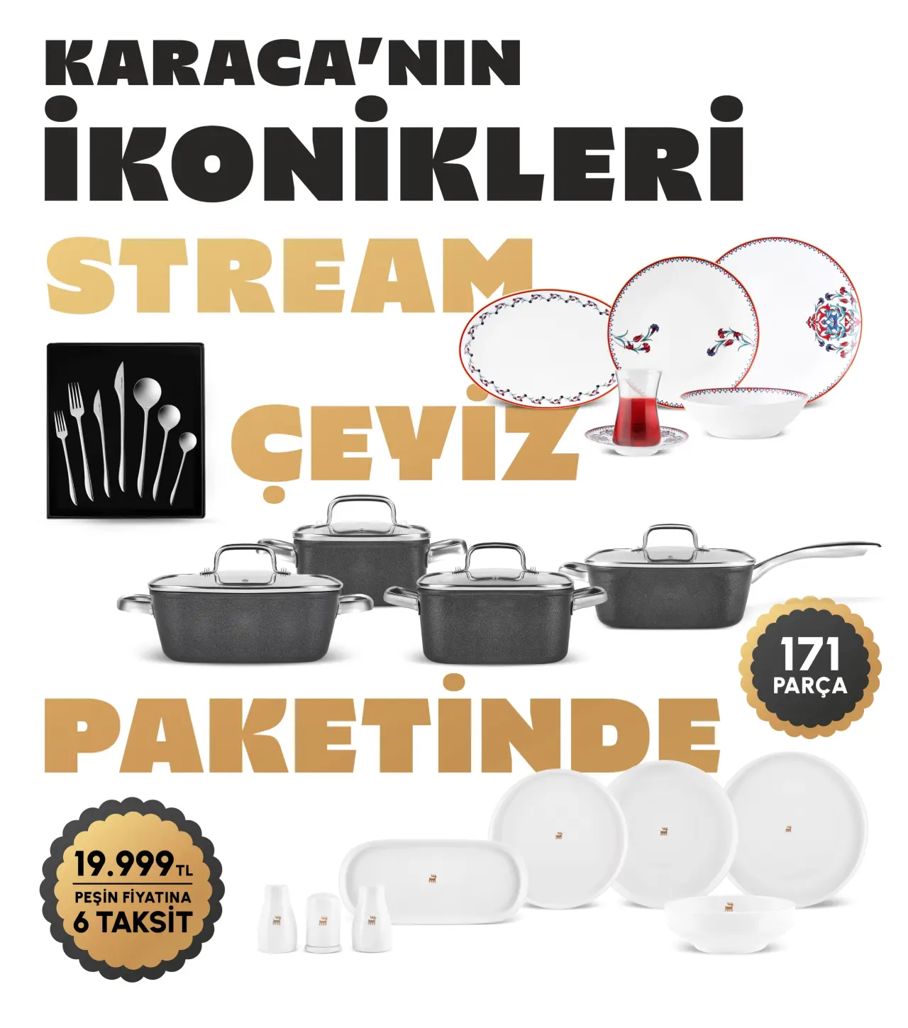 Karacaseverler, “All Star” Çeyiz Paketi ile kendi ihtiyaç ve zevklerine uygun olarak kişiselleştirilebilir bir çeyiz paketi oluşturma imkanı elde ediyor. Bu geniş yelpazede, kendi kendini temizleyen haznesi ile dikkat çeken Homend dikey süpürgeden, 316+ çelik kalitesiyle üretilmiş çatal-bıçak-kaşık setlerine; Hollywood yıldızlarının tercih ettiği Red Carpet yemek takımlarından gerçek inci detayları barındıran özel koleksiyonlara kadar çok sayıda seçenek bulunuyor. Ayrıca, tost makineleri, kahve aparatlar ve tencere setleri de özel paket içinde yer alıyor. Bu ayrıcalıklı ürünlere, yalnızca peşin fiyatına 9 taksit fırsatı ile ayda yalnızca 11.111 TL’den ulaşmak mümkün.