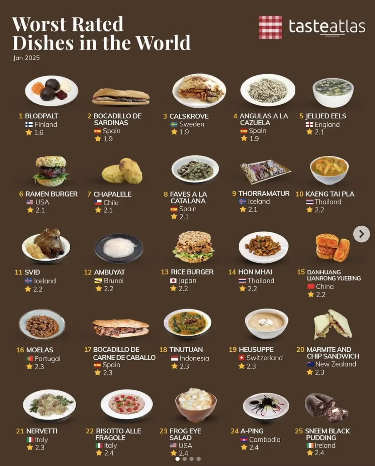 Düşük puanlı yiyeceklerin derlendiği listede ilk sırada Finlandiya’nın blodpalt adlı yemeği yer aldı. Çavdar veya arpa unu ve hayvan kanıyla hazırlanan bu geleneksel yemek, TasteAtlas kullanıcılarından en düşük puanı aldı.