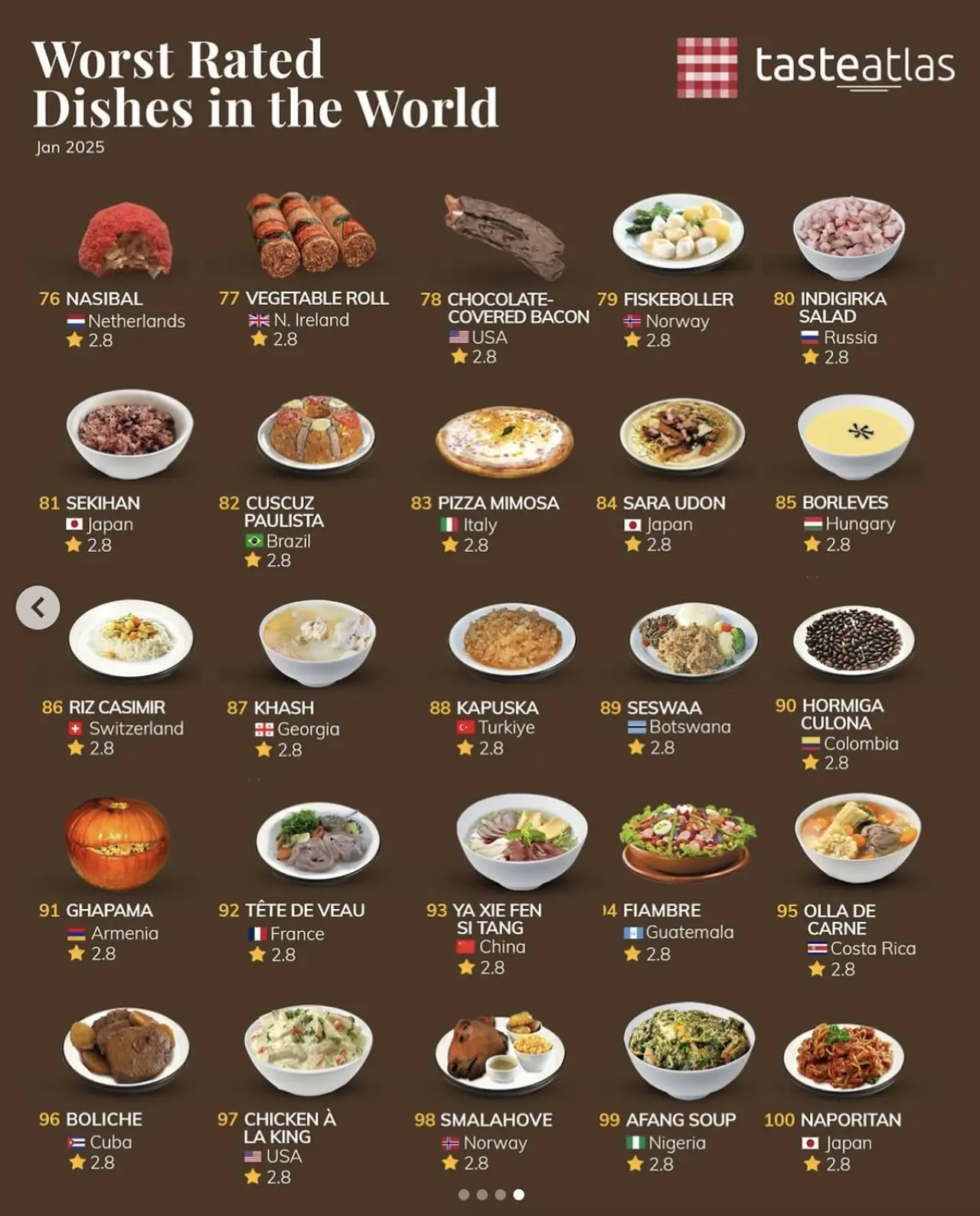 TasteAtlas verilerine göre “en kötü 100 yemek” listesinin ilk 10 basamağında şu lezzetler yer alıyor: