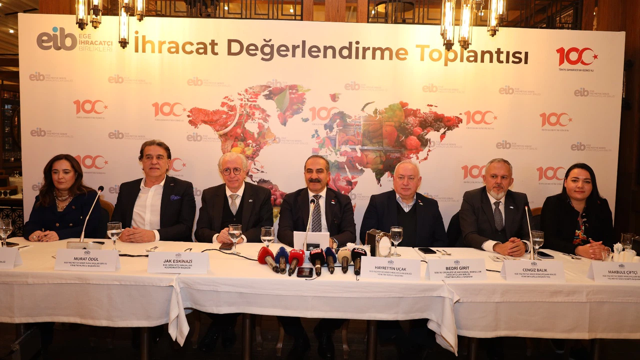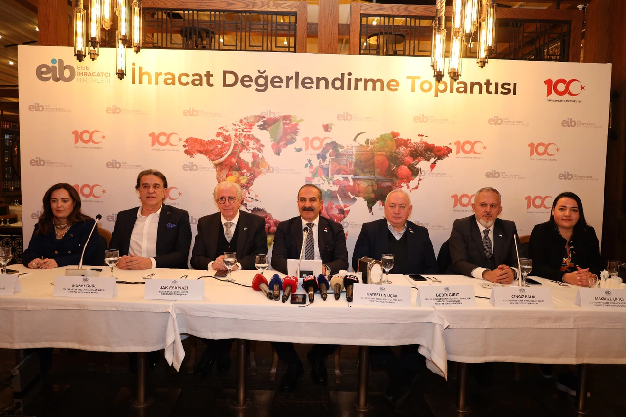 Ege Yaş Meyve Sebze İhracatçıları Birliği Basın Toplantısı, Ege İhracatçı Birlikleri Koordinatör Başkan Yardımcısı Ege Yaş Meyve Sebze İhracatçıları Birliği Yönetim Kurulu Başkanı Hayrettin Uçak, Ege İhracatçı Birlikleri Koordinatör Başkanı Jak Eskinazi, Ege Su Ürünleri ve Hayvansal Mamuller İhracatçıları Birliği Başkanı Bedri Girit, Ege Yaş Meyve Sebze İhracatçıları Birliği Yönetim Kurulu Başkan Yardımcısı Cengiz Balık, Ege Yaş Meyve Sebze İhracatçıları Birliği Yönetim Kurulu Başkan Yardımcısı Ege Yaş Meyve Sebze İhracatçıları Birliği Yönetim Kurulu Üyesi Sadık Demircan, Ege Yaş Meyve Sebze İhracatçıları Birliği Yönetim Kurulu Üyesi Kenan Unat, Ege Yaş Meyve Sebze İhracatçıları Birliği Yönetim Kurulu Üyesi Vildan Akgedik, Ege Yaş Meyve Sebze İhracatçıları Birliği Yönetim Kurulu Yedek Üyesi Ahmet Altubay, Ege Yaş Meyve Sebze İhracatçıları Birliği Denetim Kurulu Yedek Üyesi Ahmet Kaymaz, Ege Yaş Meyve Sebze İhracatçıları Birliği Yönetim Kurulu Yedek Üyesi Aydın Akyüzlü, Ege Yaş Meyve Sebze İhracatçıları Birliği Yönetim Kurulu Yedek Üyesi Berna Akyüzlü katılımıyla gerçekleştirildi.