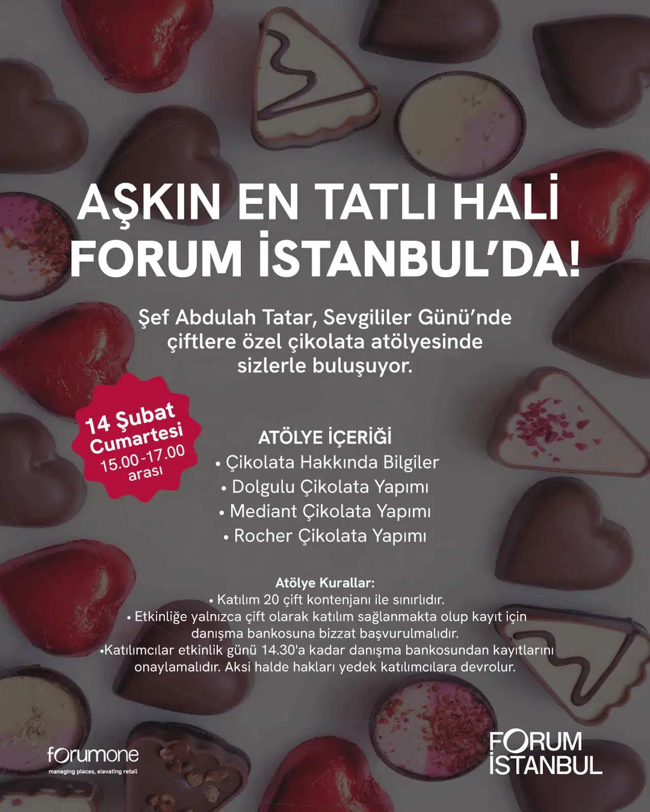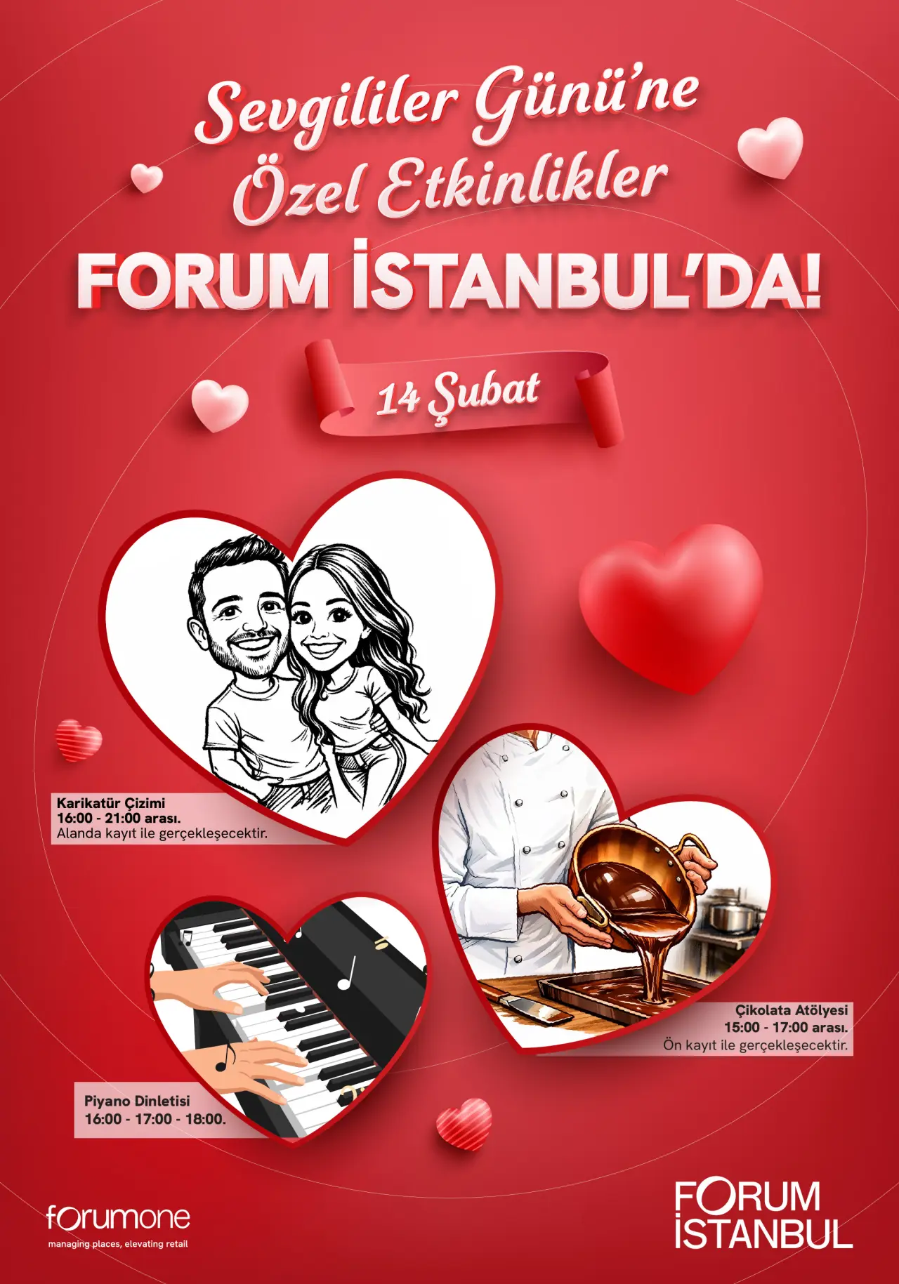 Forum İstanbul, Sevgililer Günü’ne özel olarak, çiftlere yönelik çeşitli etkinlikler sunarak aşkı sanat, müzik ve lezzetle harmanlıyor. Herkesin bu özel günde sevdikleriyle birlikte unutulmaz anılar biriktirmelerini hedefleyen Forum İstanbul, 14 Şubat’ta dolu dolu bir program hazırladı. Ünlü şef Abdullah Tatar’ın yer alacağı çikolata atölyesi, romantik piyano dinletileri ve eğlenceli karikatür çizimi etkinlikleriyle zenginleştirilecek olan bu deneyim, ziyaretçileri bekliyor.