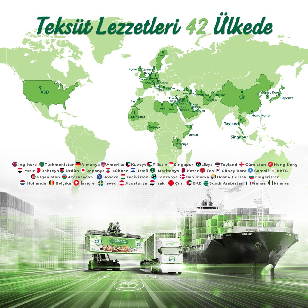 Teksüt’ün uzun yıllardır ihracat deneyimi olan bir marka olduğunu hatırlatan Mert Özmen, “Son yıllarda ihracatta daha güçlü adımlar atıyoruz. Avrupa ülkelerine giriş yaptık; ürün göndermeye başladık. Bugün Teksüt ihracatı, cirosunun yüzde 10’nu oluşturuyor. Hedefimiz bu oranı yüzde 20 seviyelerine çıkarmak. Şu anda 42 ülkede ürünlerimiz tüketiliyor.” dedi. Teksüt süt ve süt ürünlerini; Türkmenistan, Almanya, Irak, Birleşik Arap Emirlikleri - Dubai, Kuveyt, Filistin,  Singapur, Libya, Tayland, Gürcistan, Amerika Birleşik Devletleri, Hong Kong, Mısır, Bahreyn,  Ürdün, Japonya, Çin, Lübnan,  İsrail, Moritanya,  Katar,  Fas, İngiltere, Güney Kore, Somali, Afganistan, Azerbaycan,  Kosova, Tacikistan, Tanzanya, Danimarka, Fransa, Hollanda, Belçika, İsviçre, İsveç, Avusturya, Bosna Hersek, Bulgaristan, Suudi Arabistan, Kuzey Kıbrıs Türk Cumhuriyeti, Nijerya olmak üzere 42 ülkeye ihraç ediyor.
