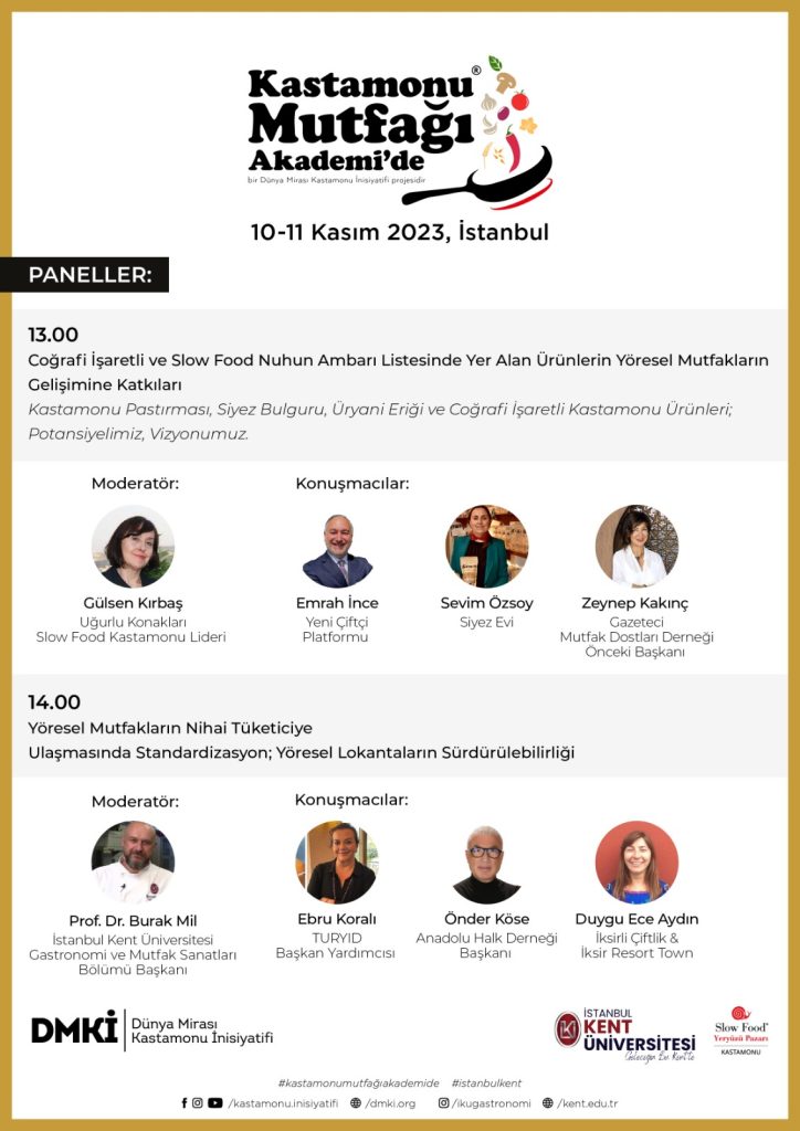 10-11 Kasım tarihlerinde gerçekleşecek etkinlikte, 10 Kasım günü saat 13.00 “Coğrafi İşaretli ve Slow Food Nuhun Ambarı Listesinde Yer Alan Ürünlerin Yöresel Mutfakların Gelişimine Katkıları”, 14.00’te ise “Yöresel Mutfakların Nihai Tüketiciye Ulaşmasında Standardizasyon; yöresel lokantaların sürdürülebilirliği” konulu iki panel yapılacak. Paneller sonrası, İstanbul Kent Üniversitesi bahçesinde açılan Slow Food Kastamonu Yeryüzü Pazarı, iki gün boyunca İstanbulluları Kastamonu’nun pastırma, siyez bulguru, mor sarımsak gibi özel ürünleri ve coğrafi işarete sahip özgün lezzetleriyle buluşturacak. Festivalde üreticilerden alışveriş yapmak mümkün olacak.