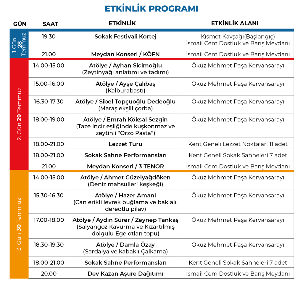 Kuşadası Sokak Festivali, 28 Temmuz Cuma günü bir kortej yürüyüşü ile başlayacak. Yürüyüşün ardından İsmail Cem Dostluk ve Barış Meydanı’nda sevilen müzik grubu KÖFN şarkılarını festival katılımcıları için seslendirecek. Festival kapsamında 29 Temmuz Cumartesi gecesi ise yine İsmail Cem Dostluk ve Barış Meydanı’nda Türkiye’nin en başarılı tenorlarından Murat Karahan, Efe Kışlalı ve Hakan Aysev, “3 Tenor” isimli bir konserle sahne alacak.