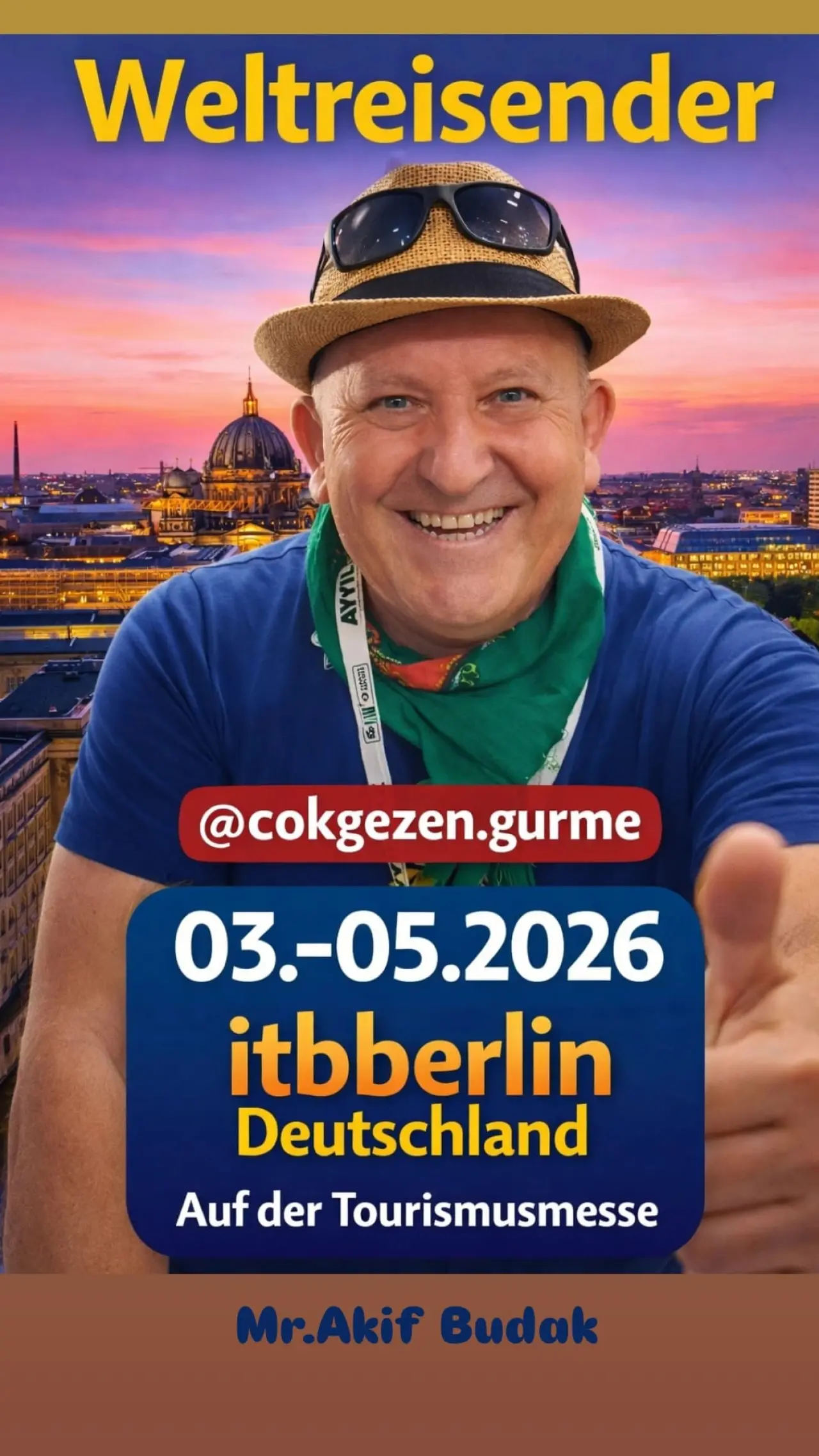 Trabzonlu tanınmış seyahat yazarı ve uluslararası etkinlik organizatörü Akif Budak, ekip arkadaşlarıyla birlikte 3-5 Mart tarihleri arasında Almanya'nın başkenti Berlin'de gerçekleştirilecek olan ITB Berlin Turizm Fuarı'nda ülkemizi temsil edecek. Bu fuar, Türkiye'nin turizm alanındaki potansiyelini uluslararası platformda tanıtma fırsatı sunuyor.