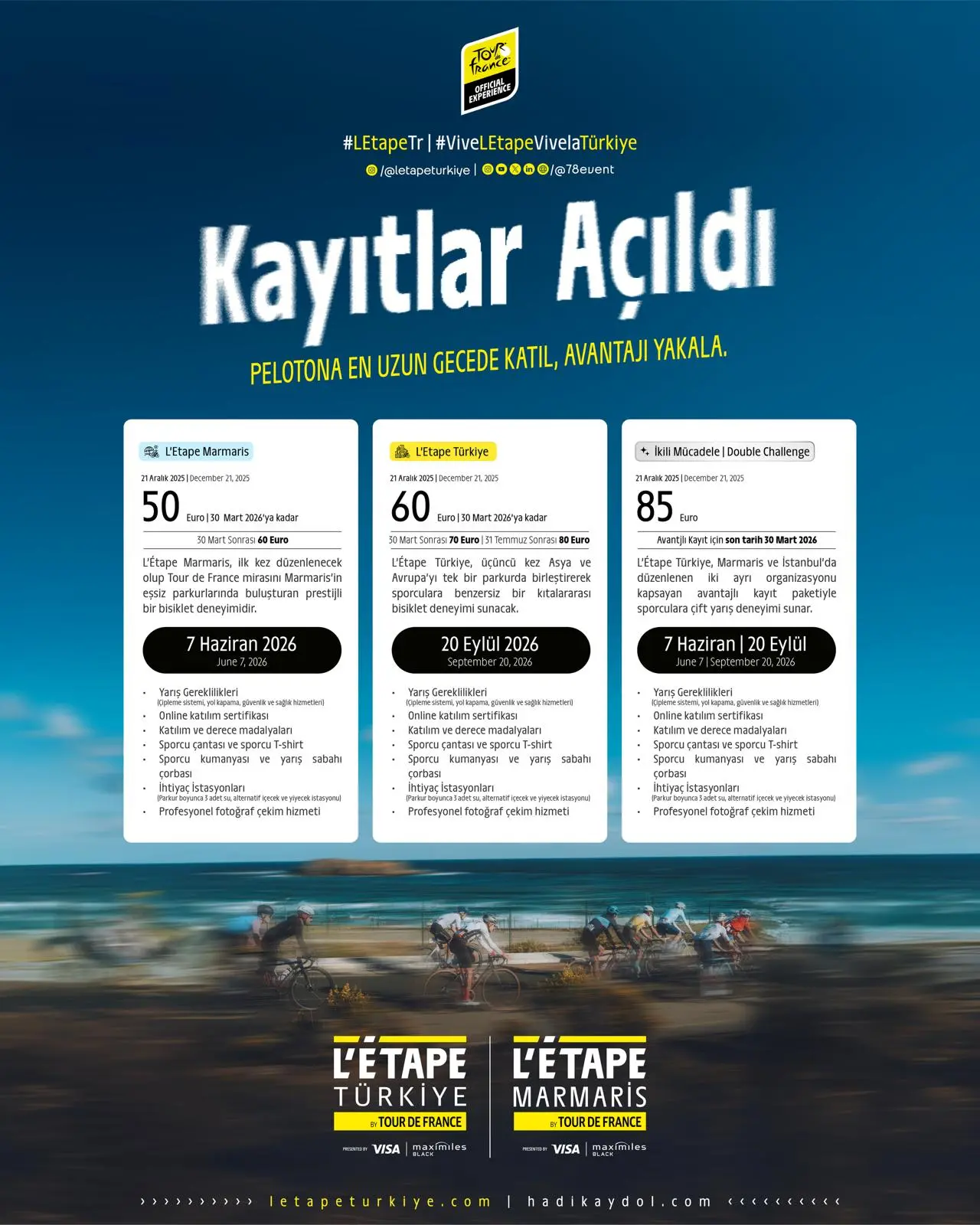 L’Étape Türkiye ve L’Étape Marmaris için kayıt işlemleri resmen başladı. Kayıtlar, yarış takvimine bağlı olarak belirlenecek tarihe kadar devam edecek. Erken kayıt avantajları sunulurken, her iki yarışa aynı anda kaydolan katılımcılara özel fırsatlar da sağlanacak. Bu sayede, daha uygun koşullarda kayıt yaptırmak mümkün olacak. Organizasyon hakkında detaylı bilgi almak ve kayıt işlemlerini gerçekleştirmek için [letapeturkiye.com](https://turkiye.letapeseries.com/) adresini ziyaret edebilirsiniz.