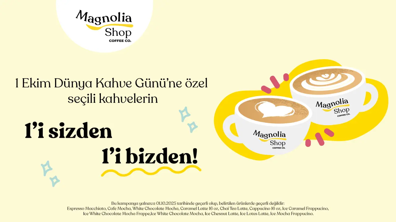 Dünya genelinde kahveseverler için önemli bir gün olan 1 Ekim Dünya Kahve Günü, Magnolia Shop’un sunduğu özel kampanya ile kutlanacak. “1’i Sizden, 1’i Bizden!” sloganı ile tüketicilere keyifli anlar yaşatmayı hedefleyen Magnolia Shop, kahve tutkunları için kaçırılmayacak bir fırsat sunuyor.