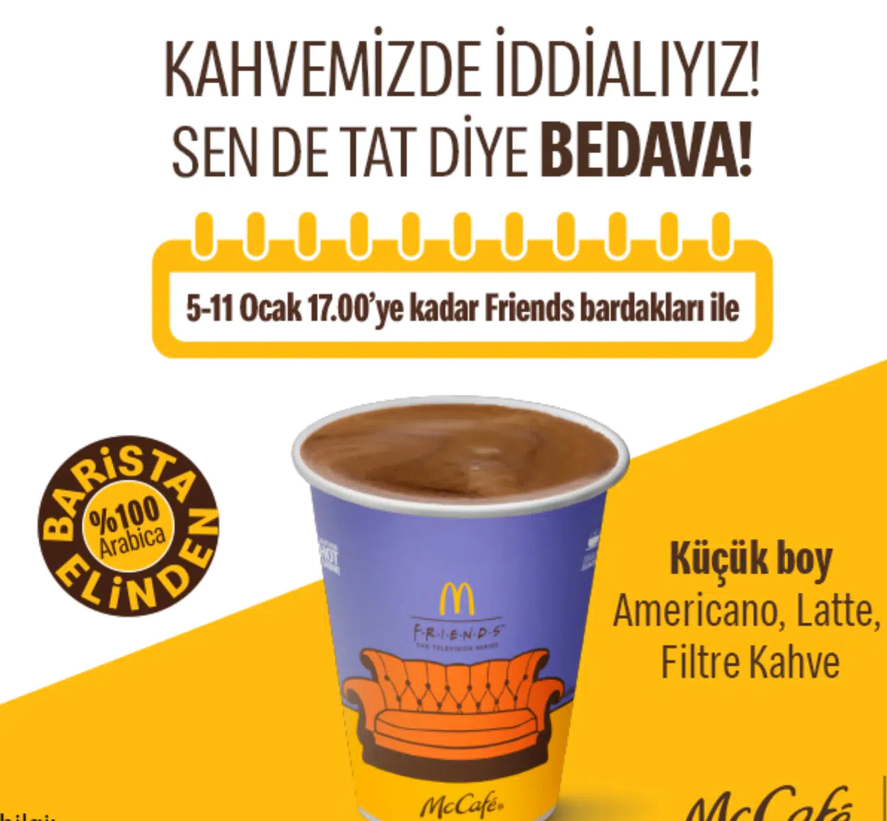 McDonald’s Türkiye, 5-11 Ocak tarihleri arasında, kahve severlere yönelik oldukça cazip bir kampanya başlatıyor. Restoranlarına gelen misafirlere, küçük boy filtre kahve, Americano ya da Latte ikram edilecek. “İyi Kahve İyi Fiyata” sloganıyla duyurulan bu özel kampanya ile sunulacak kahveler %100 Arabica çekirdeklerinden hazırlanıyor. Misafirler bu lezzetli içecekleri 07.00-17.00 saatleri arasında ücretsiz olarak deneyimleyebilecek.