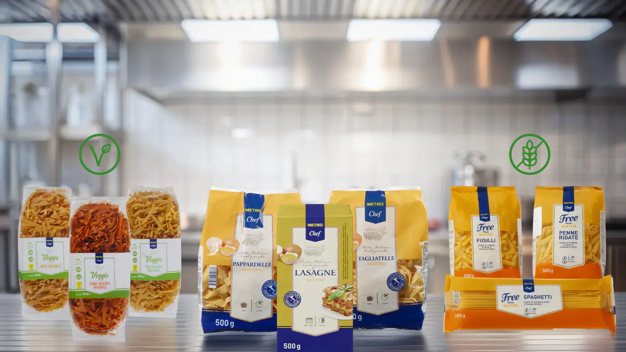 Metro Chef markası ile sunulan makarnalar, %100 İtalyan durum buğdayından üretilmekte ve %13 protein içeriği barındırmaktadır. Yapışmadan pişme özellikleri ve sundukları farklı biçimleriyle, hızlı servis odaklı mutfaklarda hız, pratiklik ve estetik çözümler sunmalarıyla tanınmaktadır. Metro Chef ürün hattı, beslenme alışkanlıklarına göre de geniş bir seçenek sunmaktadır. Kırmızı mercimek, yeşil mercimek ve nohut ile üretilen vegan makarnalar, bitkisel diet tercih edenler için ideal bir seçenek oluştururken; glutensiz makarnalar da gluten intoleransı ve çölyak hastalığı bulunan bireylere alternatifler sunmaktadır. Bu sayede her mutfak, kendi ihtiyaçlarına en uygun makarna çeşitlerini kolayca bulabiliyor.