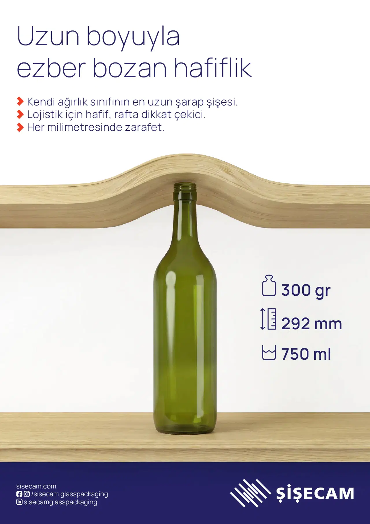 Yeni şişeler, içecek üreticilerinin farklı ihtiyaçlarını göz önünde bulundurarak, iki alternatifle tasarlanmıştır. 1000 mililitre hacme sahip 400 gramlık şişe; 302,6 milimetrelik yüksekliği ve 83 milimetrelik çapı ile premium segmentte dikkat çekici bir seçenek oluşturuyor. Diğer taraftan, 750 mililitre hacmindeki 300 gramlık şişe ise 292 milimetre yüksekliği, 73,9 milimetre çapı ve vidalı yapısıyla klasik şişe formunu ultra hafif bir tasarımla harmanlıyor. 300 gramlık şişe, aynı zamanda kategorisinde en uzun şişe olma özelliği ile de öne çıkıyor, bu da markaların vitrin sunumlarında farklılık yaratmalarına imkan tanıyor.