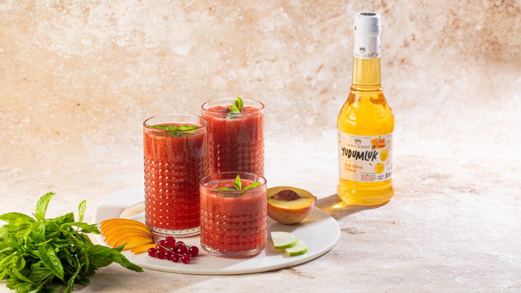 Sunum için karışımı buzlu bir bardağa ekleyip nane, frenk üzümü, elma ve şeftali dilimleriyle süsleyebilirsiniz. Afiyet olsun.