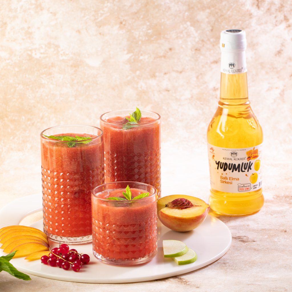 İçerisine frenk üzümü, zencefil püresi ve 2 tatlı kaşığı Kemal Kükrer Yudumluk Ballı Elma Sirkesi’ni ekleyip karşımı meyve suyu kıvamına gelene kadar robotta çekin.