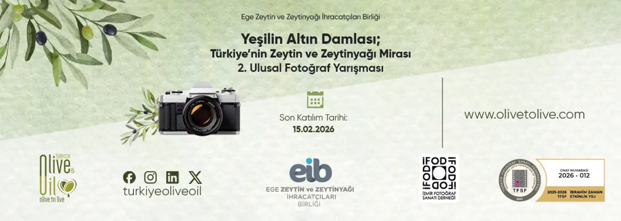 'Yeşilin Altın Damlası; Türkiye’nin Zeytin ve Zeytinyağı Mirası 2. Ulusal Fotoğraf Yarışması'nın son başvuru tarihi 15 Şubat olarak belirlenmiştir. Bu kapsamda katılımcılar, zeytin toplama ve işleme süreçlerinde doğallığı, hijyen standartlarını ve teknolojiyi yansıtan fotoğraflarla yarışmaya katılabilecekler. Yarışmanın amacı, Türkiye’nin zeytin üretimindeki kalitesini ve bu alandaki geleneksel mirası görsel sanatlar aracılığıyla tanıtmaktır. Katılımcılara, zeytinin sofralara kadar uzanan yolculuğunu anlatan etkileyici fotoğraflar ile bu sürecin zenginliğini aktarmaları beklenmektedir.