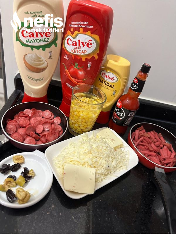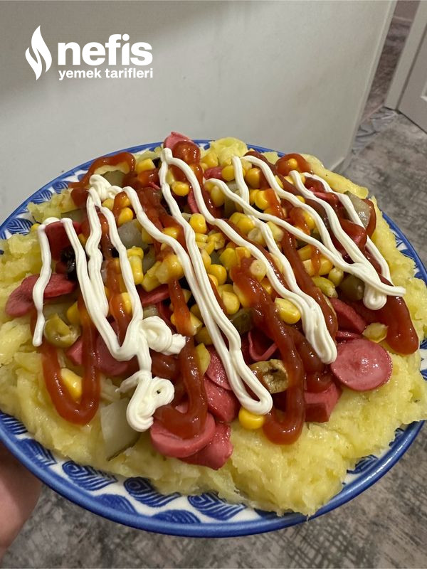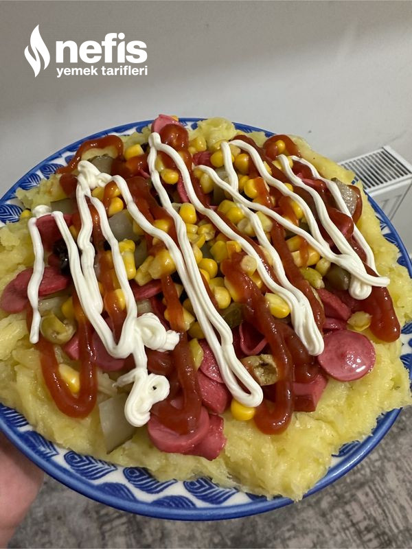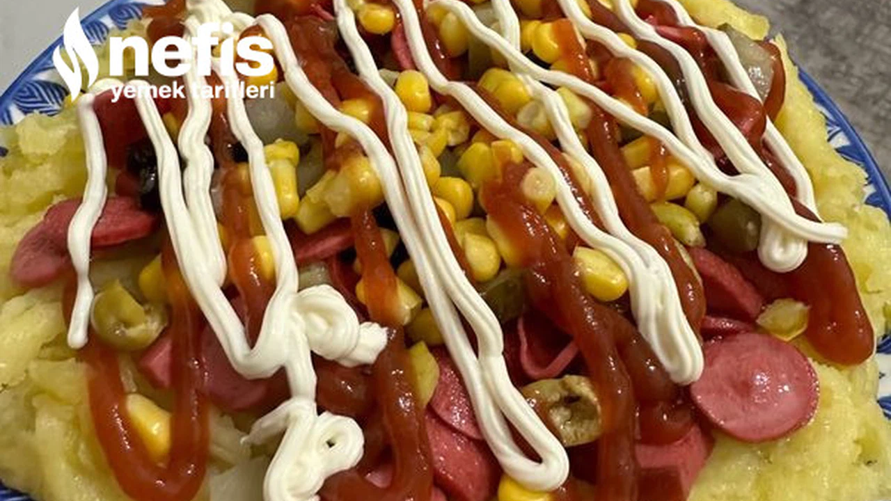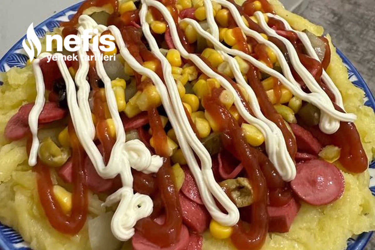 - Üzerine salamı, sosisi, mısırı, zeytini koyup sosları da ekliyoruz. Kumpirimiz hazırdır. Afiyet olsun.