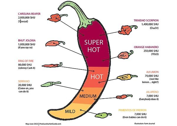 Acı biberlerle ilgili internet sitesi PepperScale’e göre habanero biberinin Scoville derecesi 100 binle 350 bin arasında değişiyor. Jalapeno biberinin Scoville derecesiyse 2 bin 500’le 8 bin arasında.