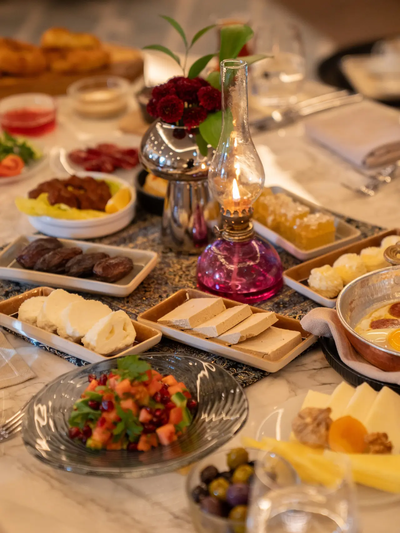 Ramazan sofralarının en klasik öğeleri arasında yer alan iftariyelikler, bu özel menüde dikkat çekiyor. Medine hurması, Hatay kırma zeytini, Trakya eski kaşarı ve Ezine beyaz peyniri gibi seçkin tatlar, tahin helvası, gül reçeli, petek bal ve kaymak ile birlikte servis ediliyor. Bu özel sunum, misafirlere adeta bir lezzet yolculuğuna çıkarıyor. Ayrıca, domates ve salatalık söğüş, tahin–pekmez, tuzlu tereyağı, pastırma ve çoban salata gibi zengin alternatifler, paylaşım kültürünü yansıtan bir başlangıç oluşturuyor.