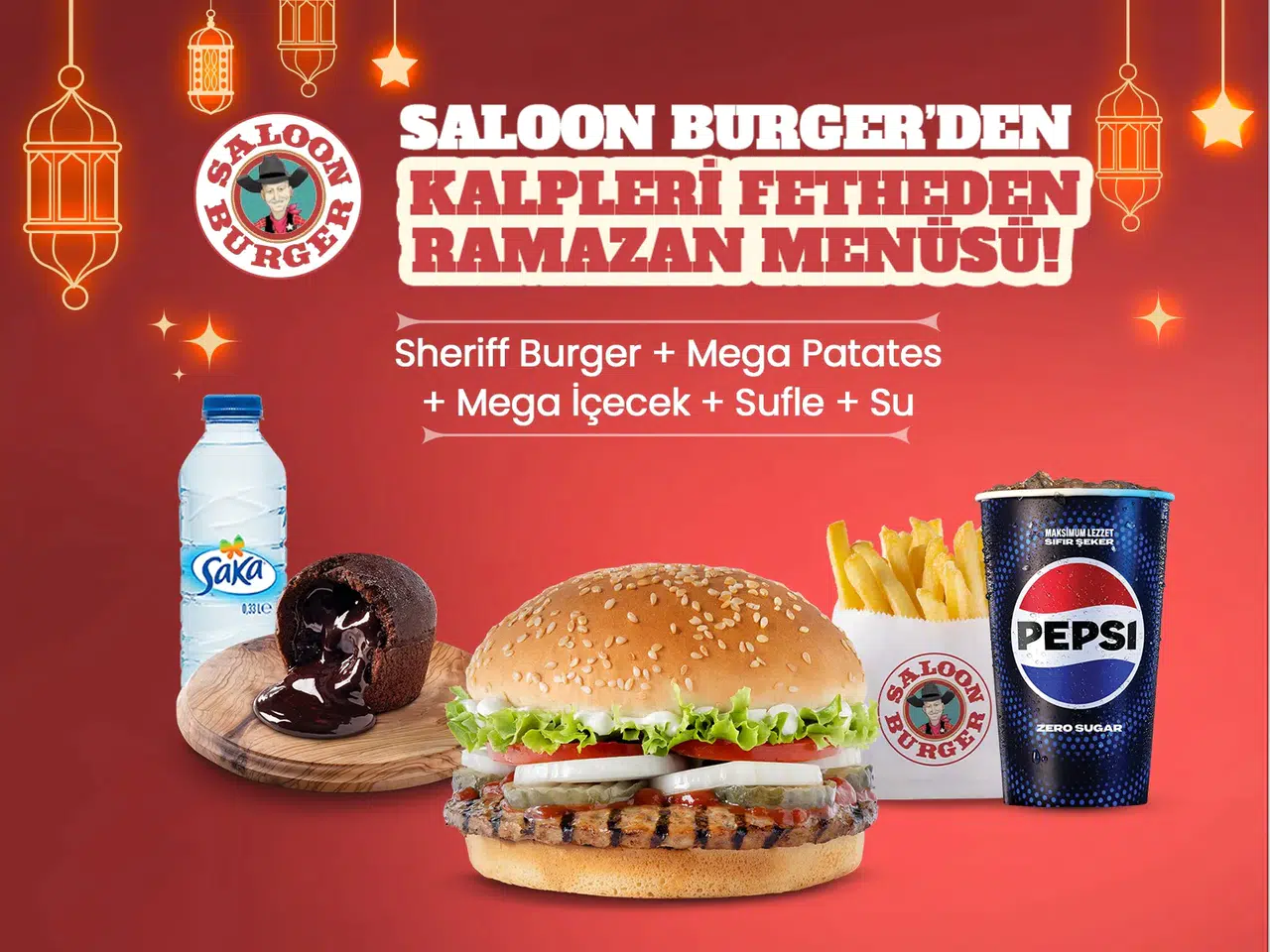 Ramazan ayına özel olarak Saloon Burger, iki farklı menü seçeneği sunuyor. Ramazan Menü 1; içeriğinde Sheriff Burger, Mega Patates, Mega İçecek, sufle ve su ile birlikte geliyor. İkinci seçenek Ramazan Menü 2 ise Efsane Dostum Burger, Mega Patates, Mega İçecek, sufle ve su içeriyor. Bu menüler, ana ürünüyle beraber sunulan büyük porsiyonlu ikramlar ve tatlı dokunuşlar ile dolu bir iftar deneyimi sağlıyor. Doyuruculuğu ön planda tutan bu menüler, geleneksel Ramazan sofralarına modern bir dokunuş getiriyor. Saloon Burger, bu özel menüleriyle iftar saatlerini daha da keyifli hale getiriyor.