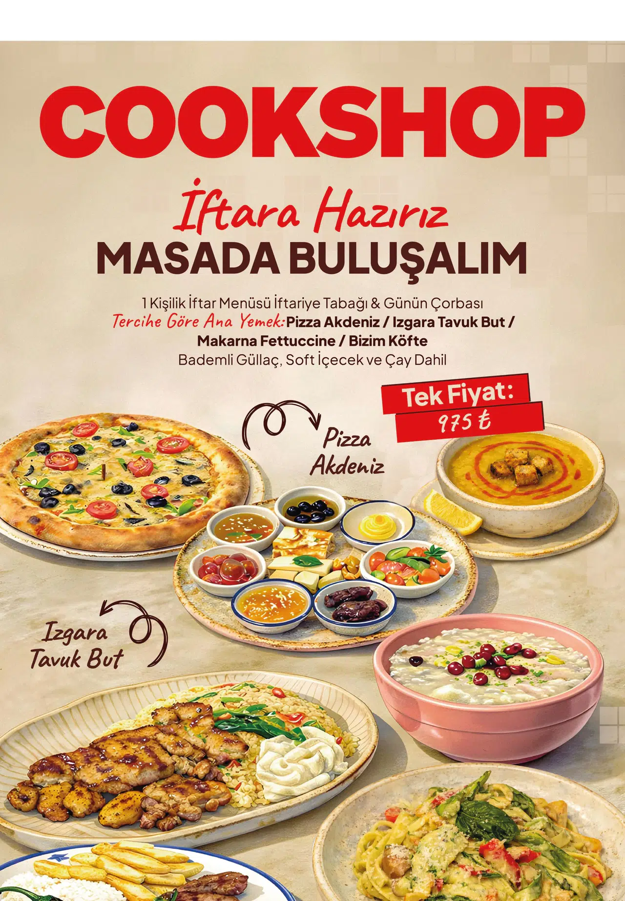 Cookshop’un "Şehrin Masası" sloganıyla oluşturulan iftar menüsü, zengin içerikleriyle dikkat çekiyor. Geleneksel tatları modern yorumlarla sunan marka, iftar sofrasında başlattığı ziyafetin ilk kısmında iftariyelik tabağı ile misafirleri karşılıyor. Akabinde, günün taze çorbası gelerek sofradaki lezzet yolculuğunun ilk adımını atıyor. Ana yemek tercihini misafirlere bırakırken, çeşitli seçenekler sunarak her damak tadına hitap ediyor. İtalyan mutfağının gözdesi Fettuccine Makarna, ev yapımı tadındaki Bizim Köfte, denizden gelen tazeliği sunan Pizza Akdeniz ve şeflerin maharetle hazırladığı Izgara Tavuk gibi dört farklı seçenek ile misafirlerin beğenisine sunuluyor.