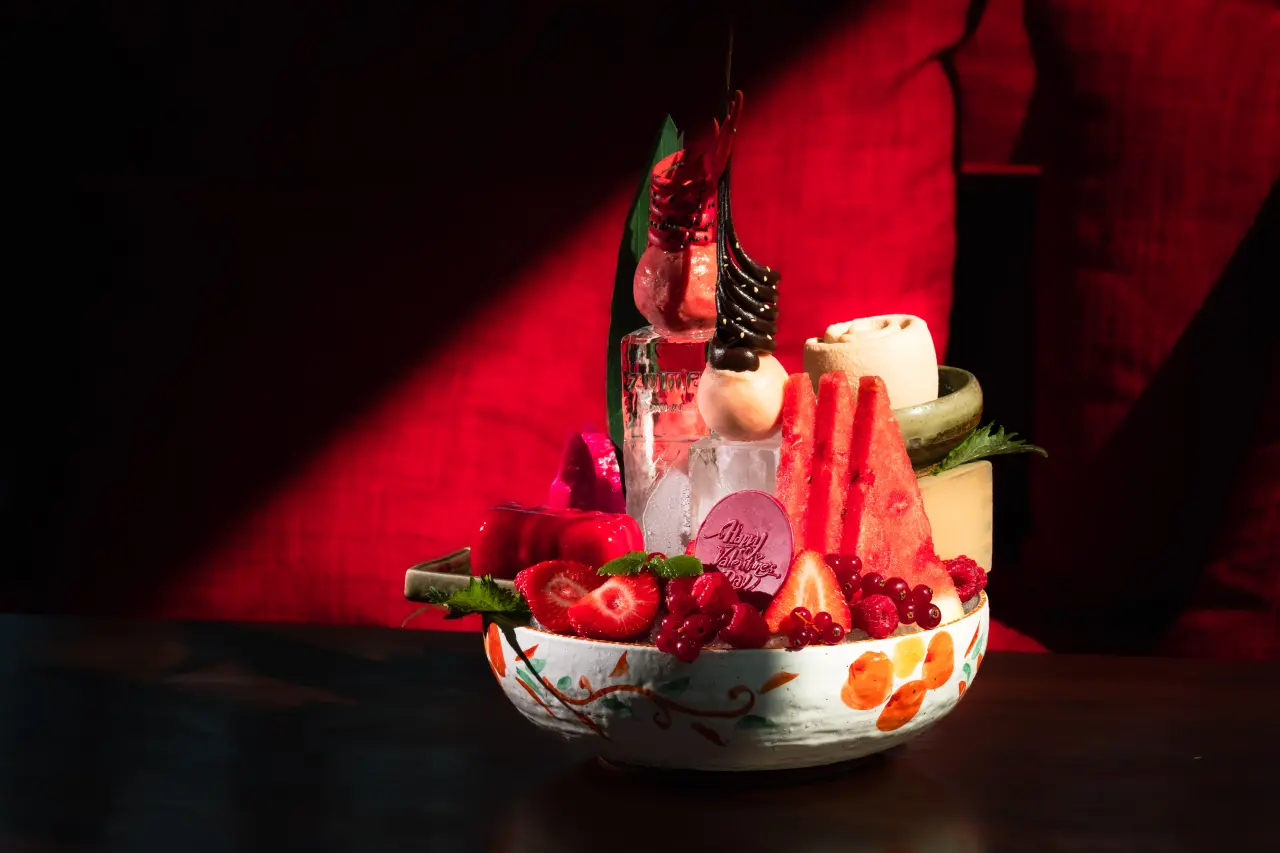 Ana yemek kategorisi de oldukça çarpıcı tatlar içeriyor; wafu sosu ve çıtır sarımsakla servis edilen antrikot, umeboshi, shiso ve mentaiko ile zenginleştirilmiş deniz tarağı ve hoba yaprağında pişirilmiş miso ile marine edilmiş morina balığı, güçlü ama aynı zamanda dengeli bir final sağlıyor. Sevgililer Günü'ne özel tatlı tabağı ile bu eşsiz akşam, zarif bir dokunuşla taçlandırılıyor.