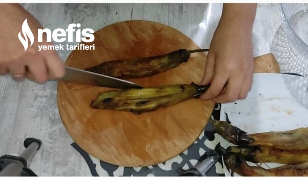 - Közlenmiş patlıcanları ince bir şekilde doğruyoruz ve soğumaya bırakıyoruz.