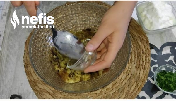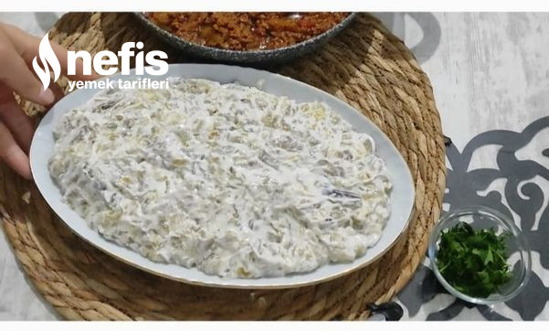 - Yoğurdun içine sarımsak ve ince doğranmış patlıcanları ekleyip meze yapıyoruz.