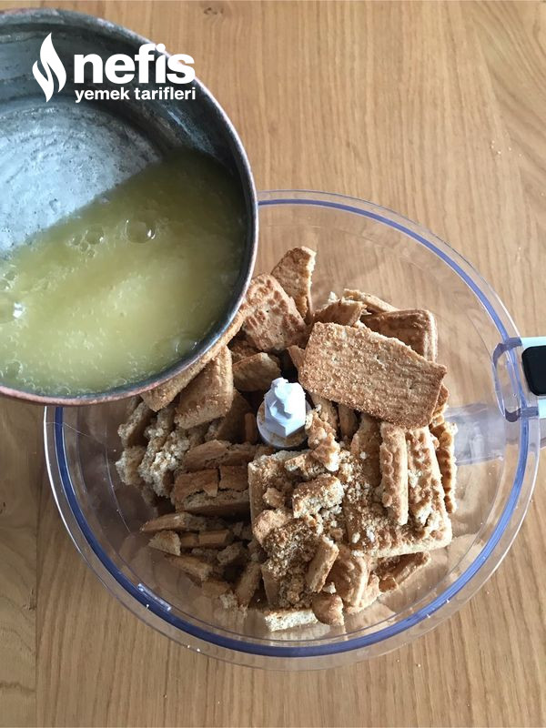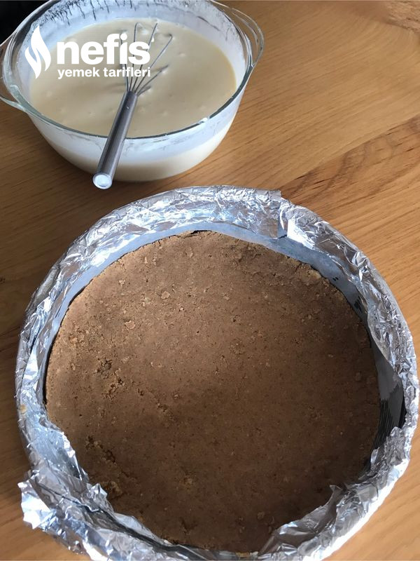 - Bisküvileri fındık ve eritilmiş tereyağı ile rondodan geçirip yağlı kağıt kaplayıp kenarlarını alüminyum folyo ile kelepçeli kalıbın etrafını sardım. Kalıba boşaltıp yaydım. Bastırıp 10-15 dk buzdolabında beklettim.