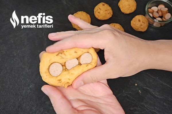 - İlk bezeyi alalım ve ortasını parmakla ezip elde ettiğimiz çukura 3 er adet dilim sosis dizelim.