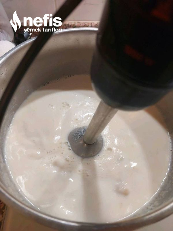- Hemen blenderımızla başlıyoruz karıştırmaya pürüzsüz bir kıvam elde edince şekeri de ilave edip blenderla karıştırmaya devam ediyoruz.