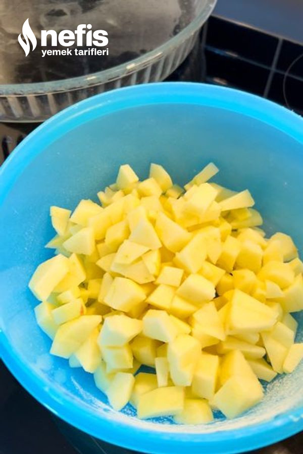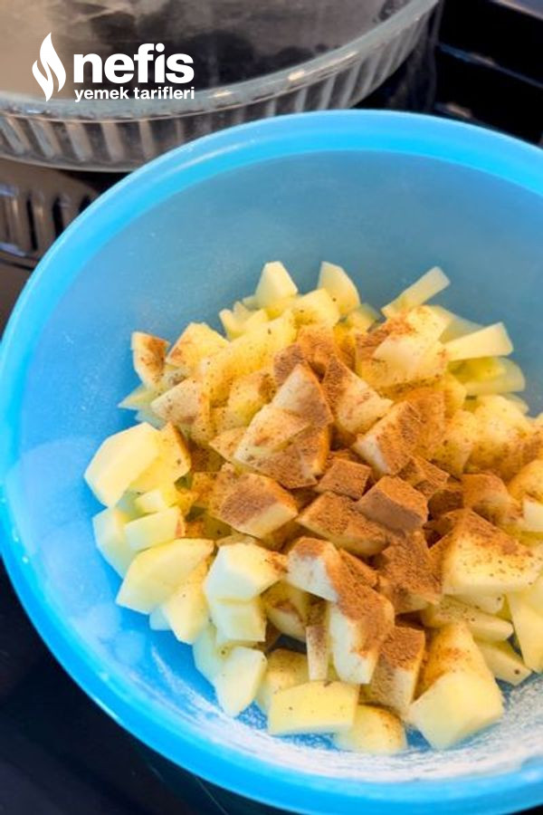 - Üzerine için elmaları küçük küp küp doğrayıp tarçınla karıştırıp kek hamurunun üzerine serpiştirin.