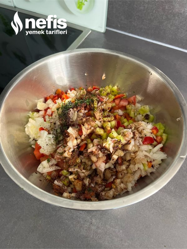 - Soğanı, kapya biberi, maydanozu ve sivri biberide küçük küçük doğrayıp bir kabın içine ilave edin.