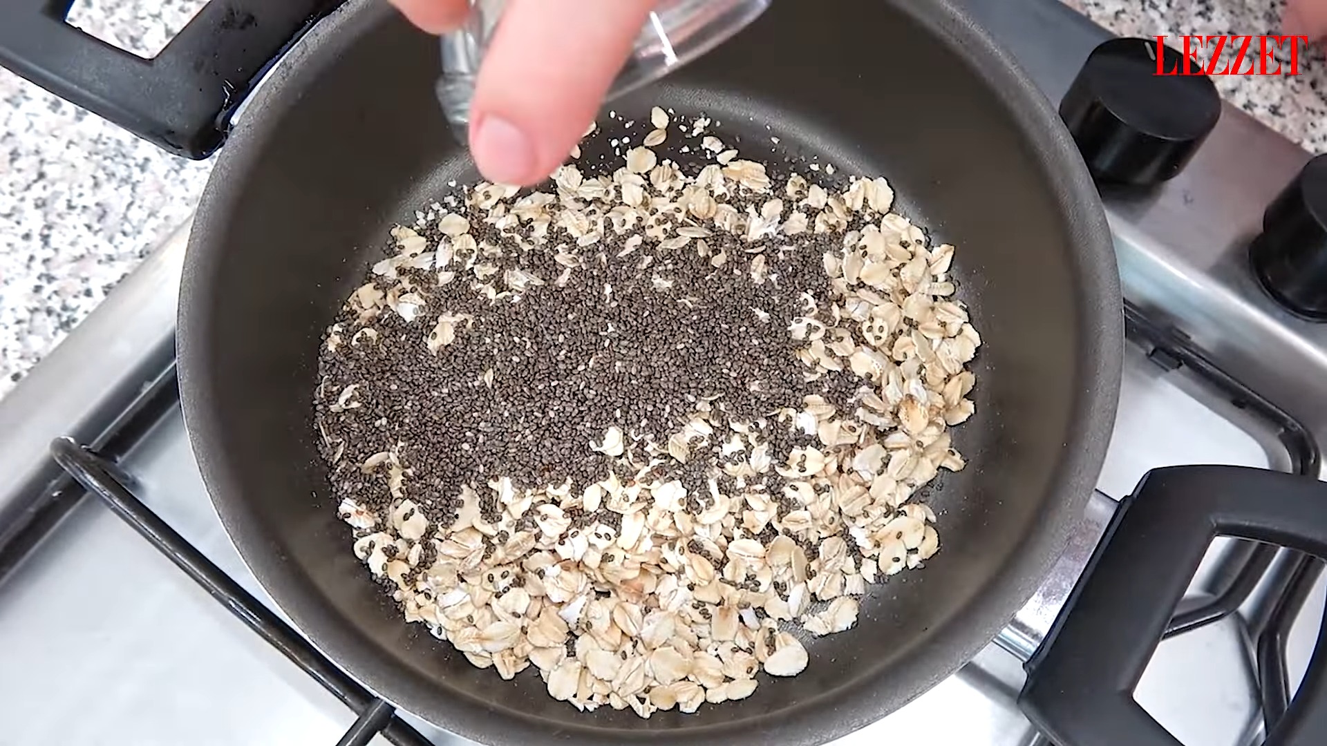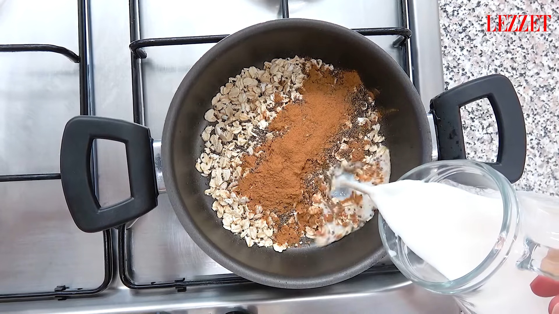 - Öncelikle tencereye yulaf, chia tohumu ve tarçını alın.