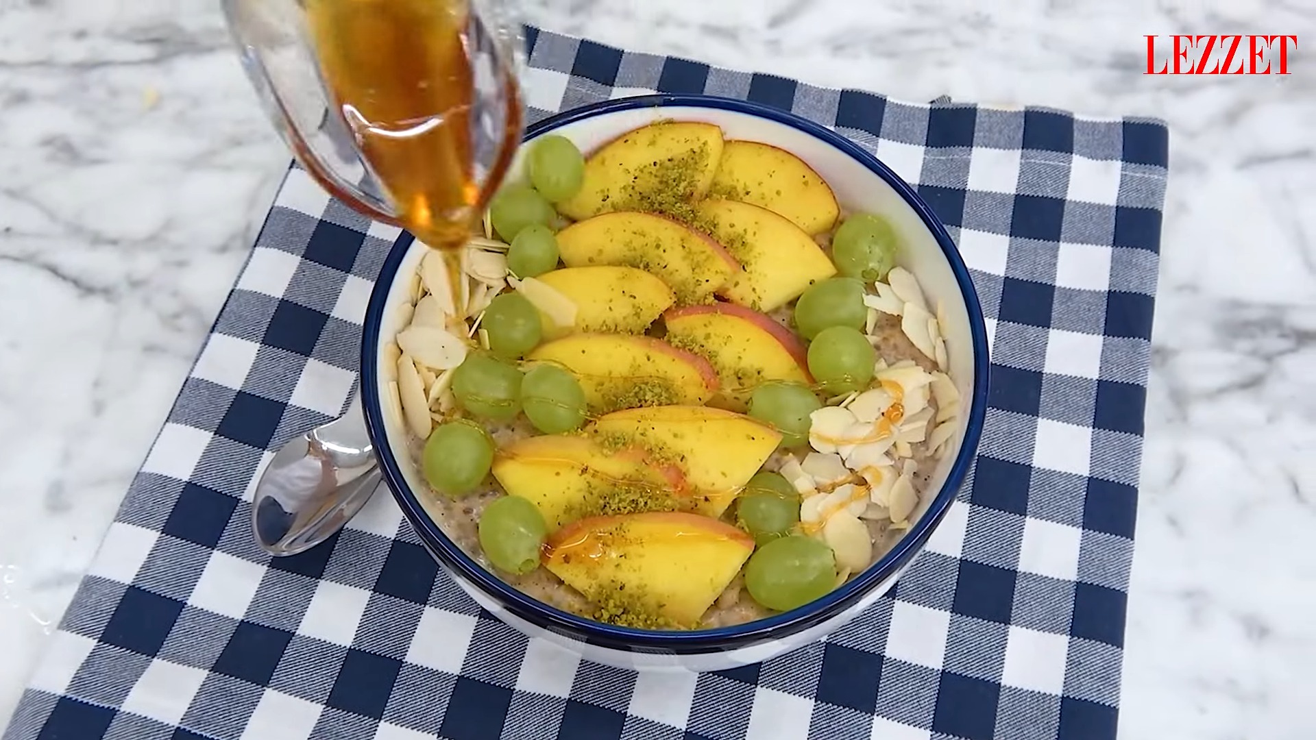 - Badem, hindistan cevizi, antep fıstığı üzere sevdiğiniz kuruyemişleri serpiştirin. Yulaf lapasının üzerinde bal gezdirin.