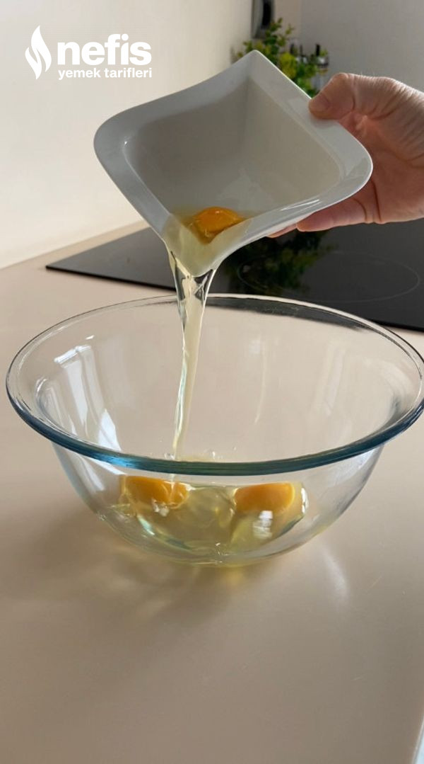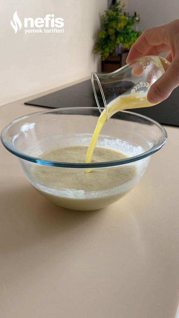 - Önce tereyağını eritip kenara alalım. Yumurtaları, suyu ve sütü güzelce karıştıralım. Şekeri ve unu da azar azar ekleyerek pürüzsüz bir kıvam alana kadar mixer ile çırpalım.
