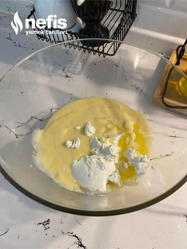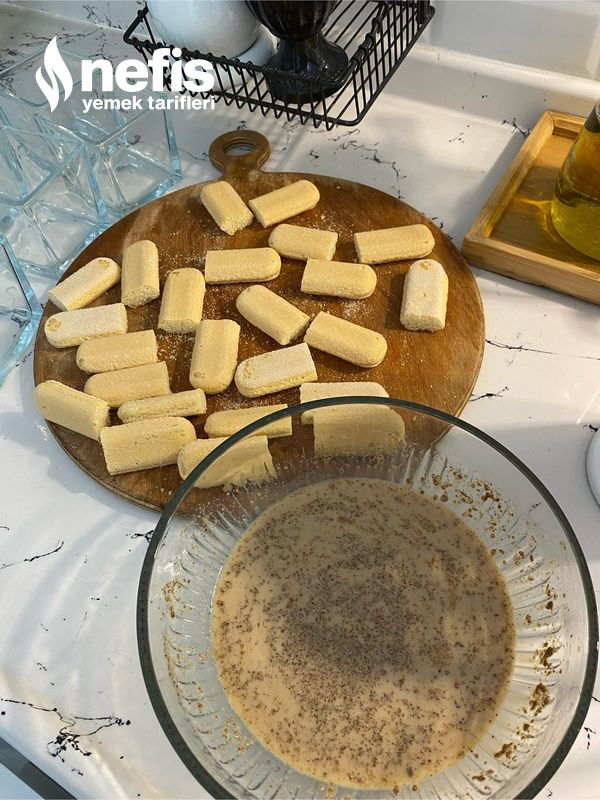- İlk sıcaklığı çıkınca labne peynirini ekleyip çırpalım. Kedidili bisküviler ikiye keselim. Islatmak için bir kasede süt ve nescafeyi karıştıralım.