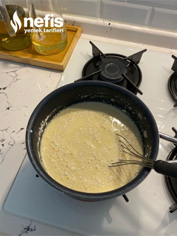 - Tencereye süt, şeker, un, yumurta sarısı alınıp karıştıralım. Kaynayıncaya kadar karıştırarak pişirelim. Ocaktan aldıktan sonra tereyağını ekleyip karıştıralım.