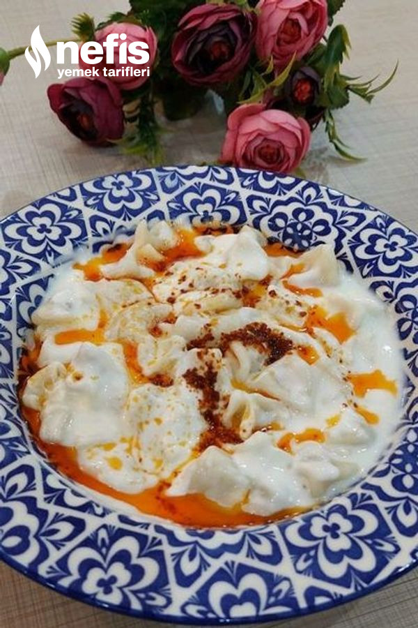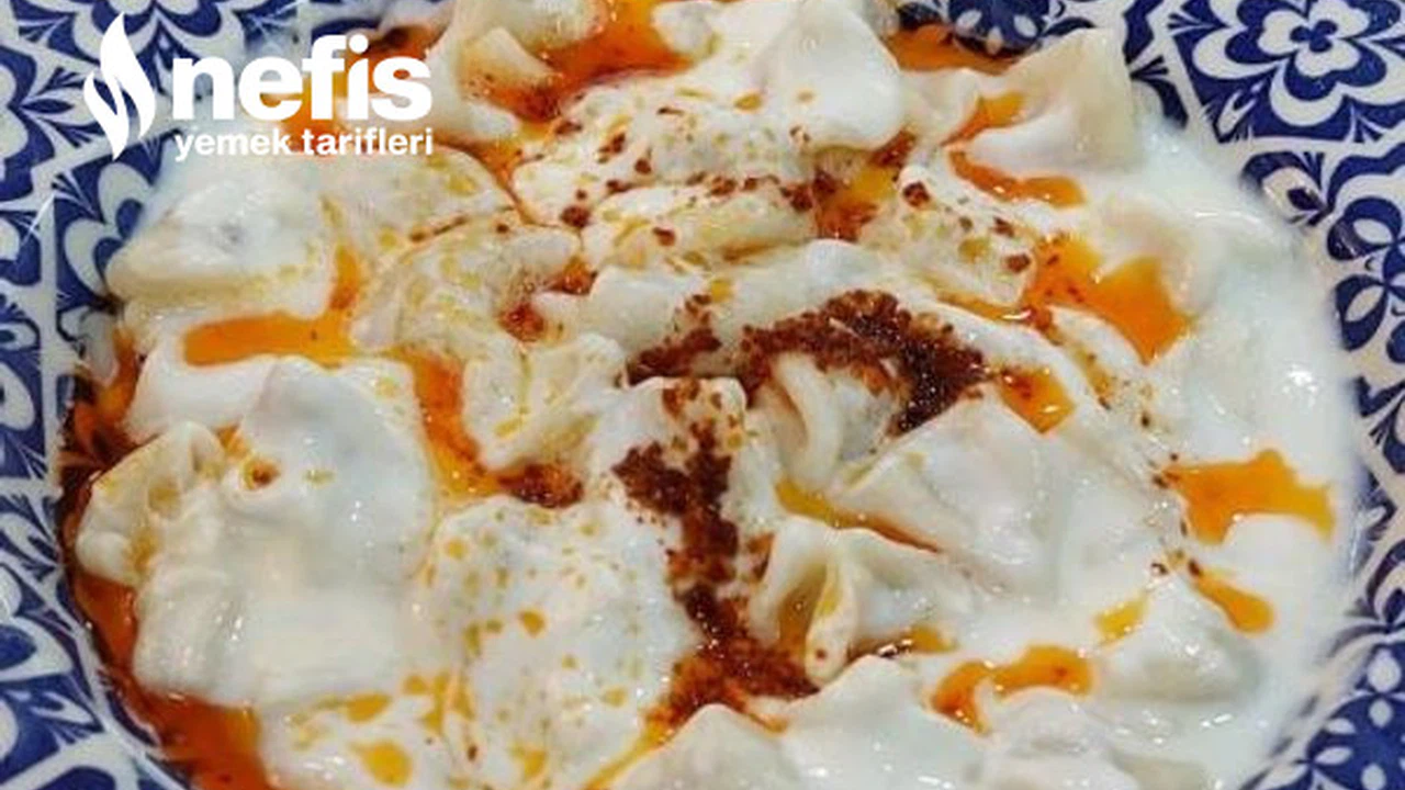 - Pişirmiş olduğumuz mantıları servis tabağına alıp sarımsaklı yoğurdumuzu ekleyelim.