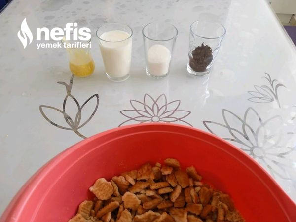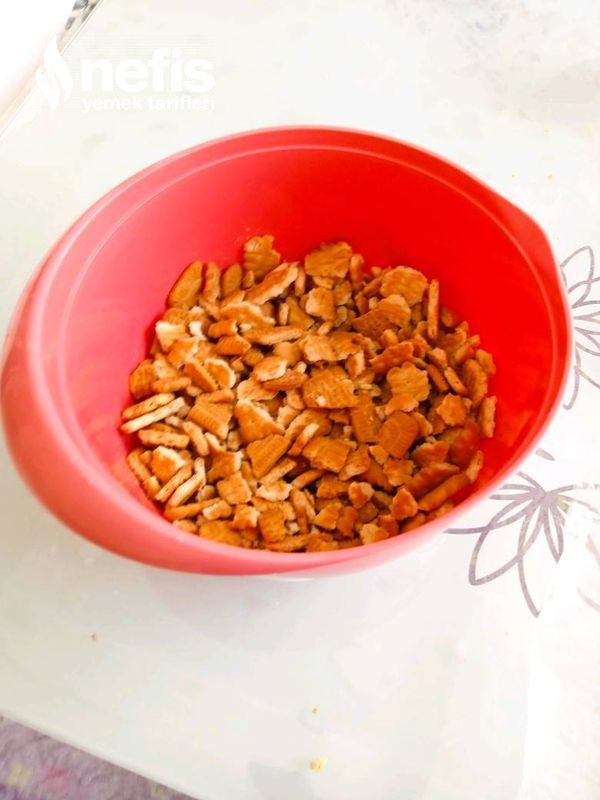 - Daha sonra süt ve erittiğimiz tereyağı veya margarin bisküvilere eklenir.