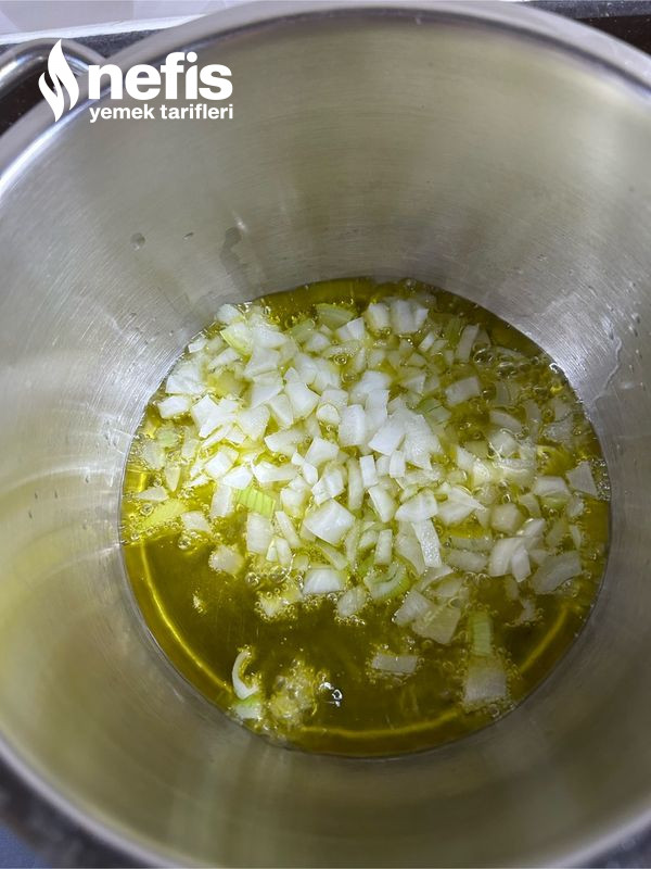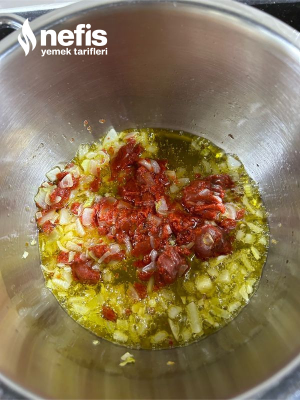 - Bir tencereye zeytinyağı ve küp küp doğradığımız soğanı ekleyip kavuralım. Üzerine salçayı ekleyelim ve tüm baharatları içerisine koyup kavuralım.