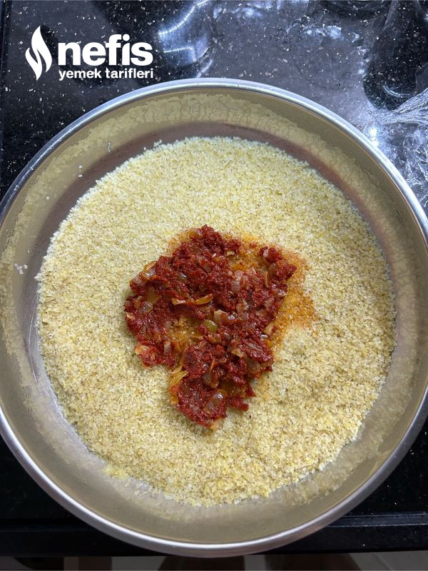 - Bulgurların üstüne salçalı sosu ekleyelim ve iyice yedirene kadar karıştıralım.