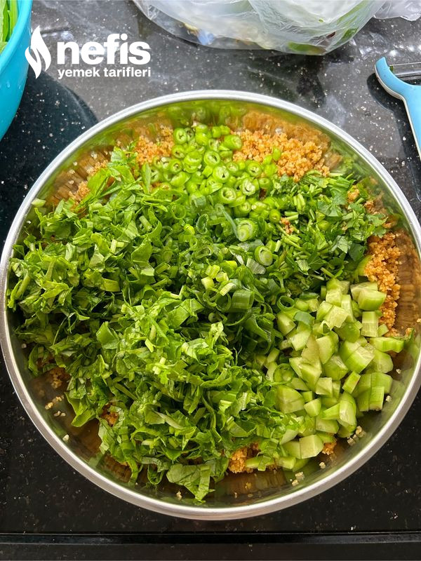 - 1 kabın içinde 3 su bardağı bulgurun üzerine 3 su bardağı kaynamış suyu ekleyelim üzerini kapatıp 15 dk. Suyu çekmesini bekleyelim.