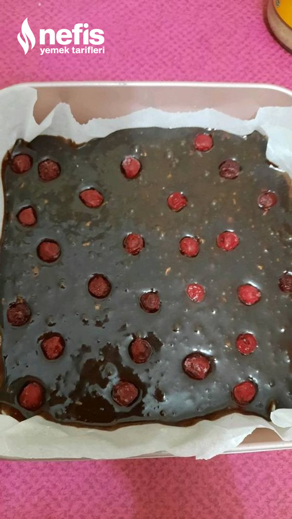 - Erittiğimiz çikolataları yumurtayı pişirmemesi için 3 evrede ekliyoruz. Borcama döküp, vişnelerini ekliyoruz.